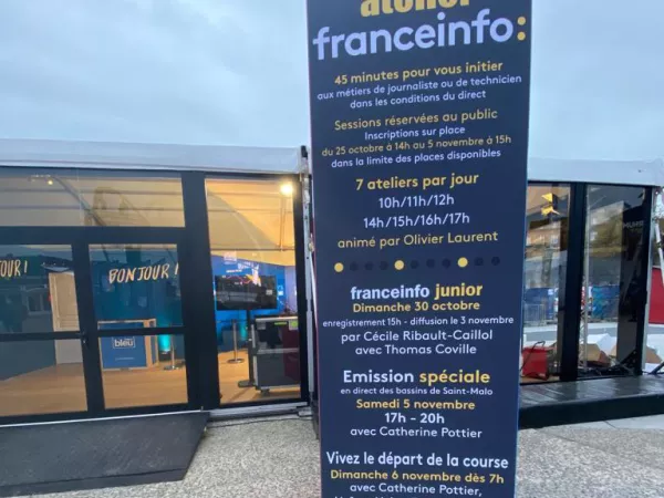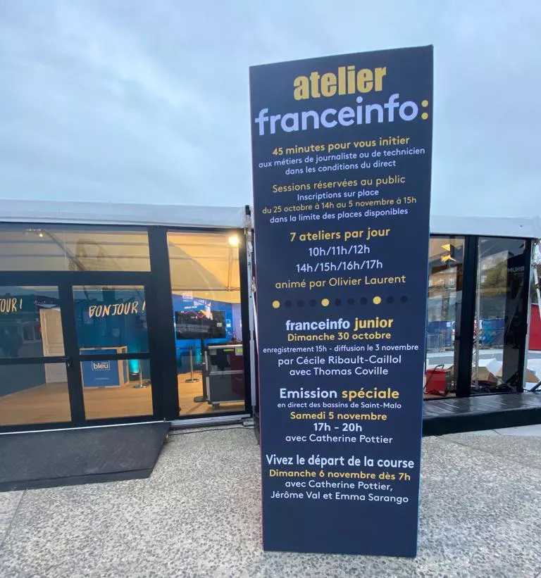 Du 25 octobre au 6 novembre 2022, vous êtes invités à nous rejoindre au pavillon Radio France, situé à l'entrée du village, face à la ville close, en zone 4. Vous pourrez ainsi rencontrer les équipes de franceinfo, de France Bleu et celles de France Inter mais aussi participer aux coulisses de la régate autour d’ateliers franceinfo dédiés à la découverte du monde de la radio, d'interviews et d'émissions en direct.