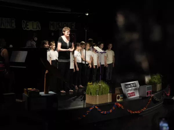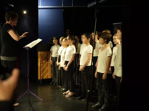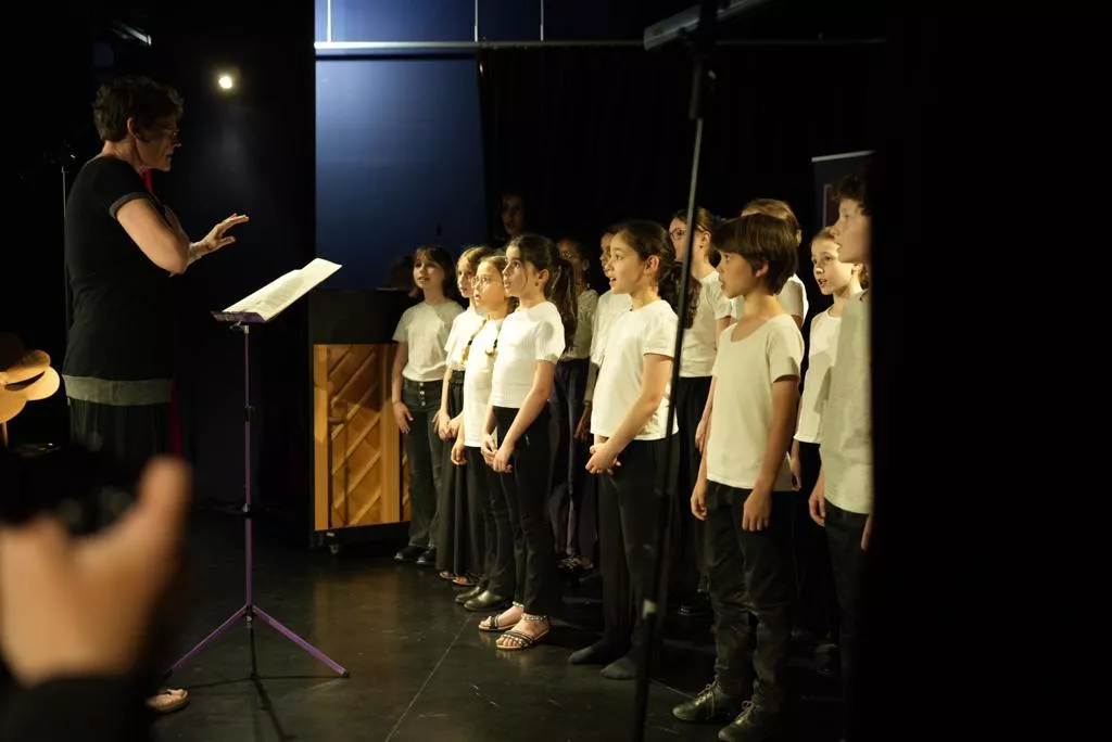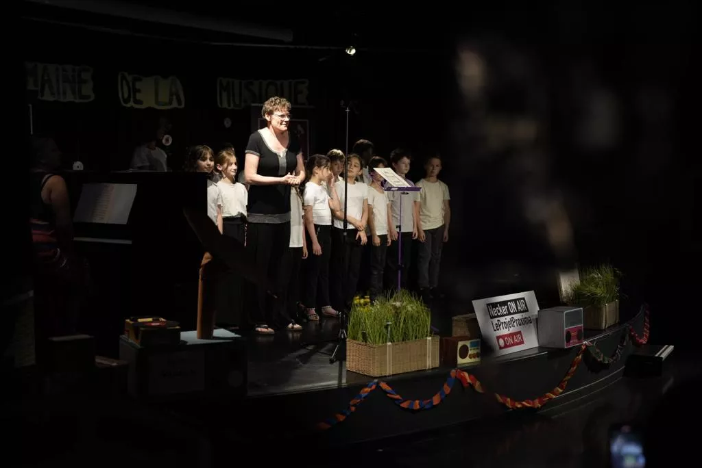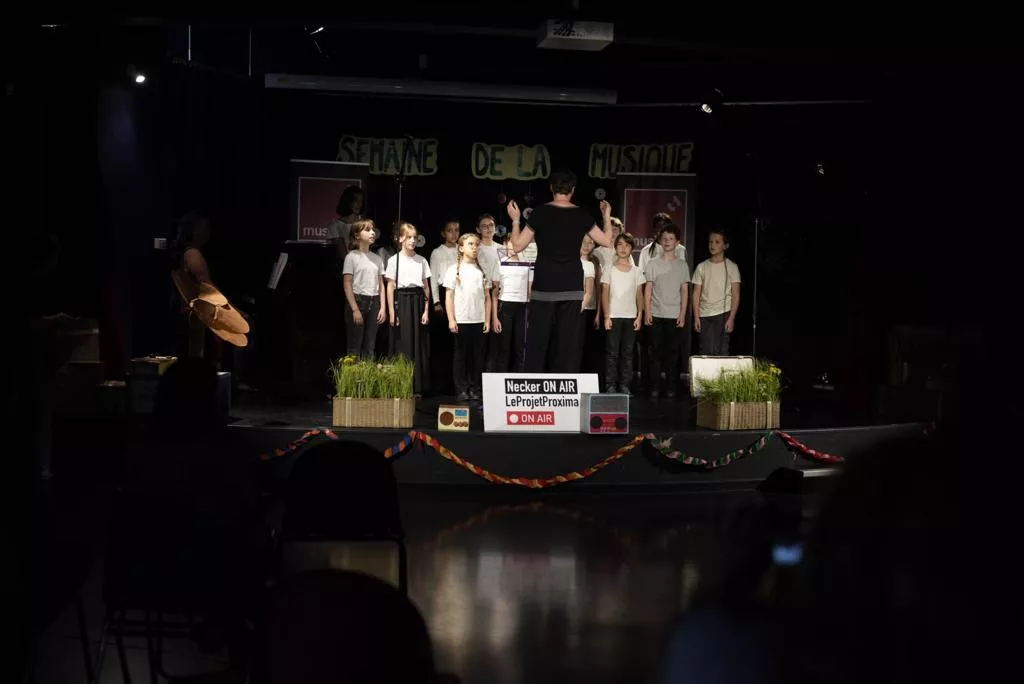 Dix-sept enfants de la pré-Maîtrise de Radio France et Sylvie Kolb au piano placés sous la direction de Marie-Noëlle Maerten interprètent Petites Histoires Naturelles d'Isabelle Aboulker, à l'Auditorium de l'hôpital dans le cadre du projet PROXIMA.