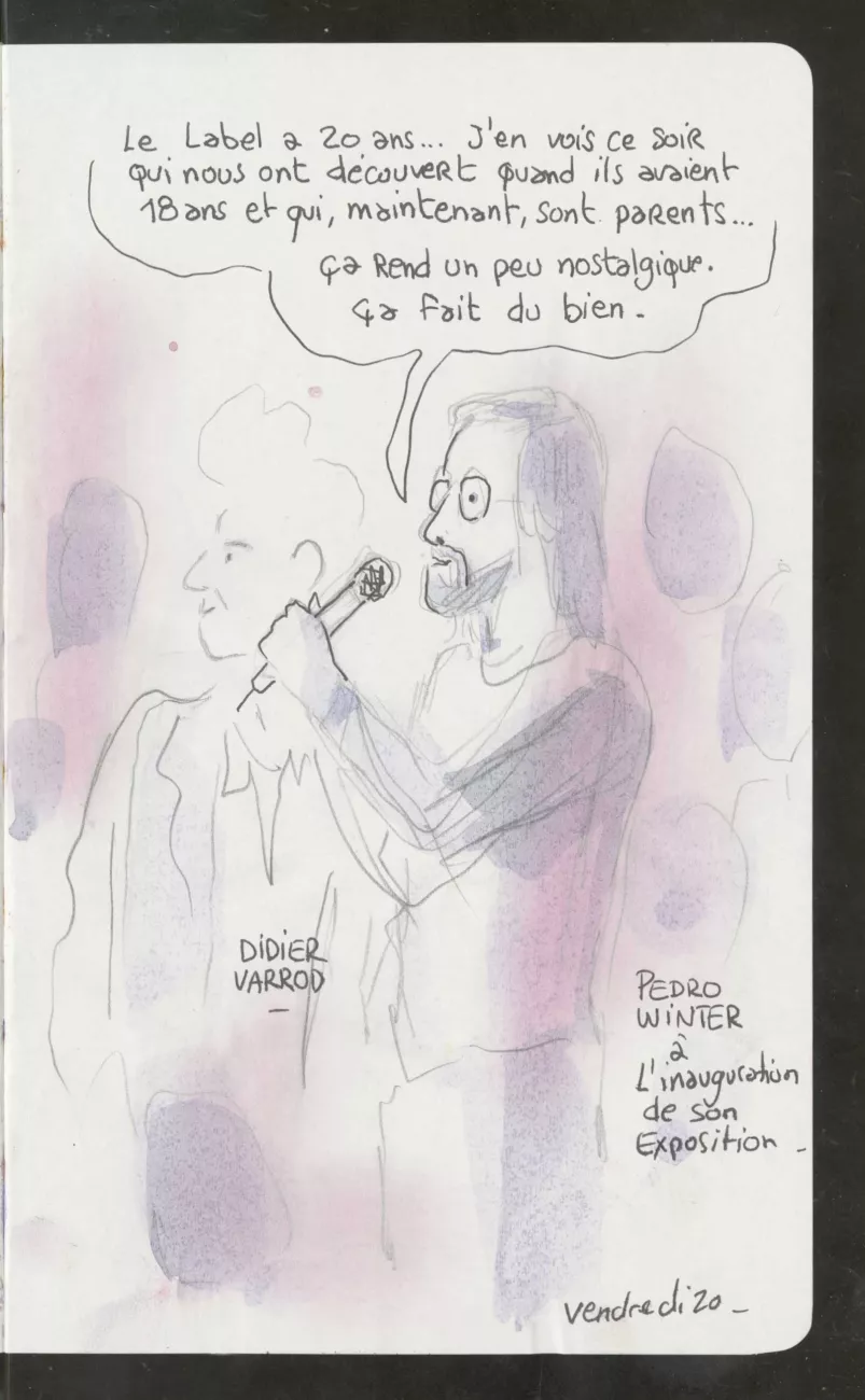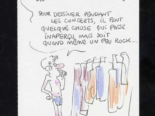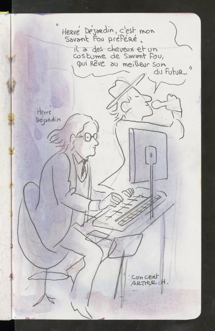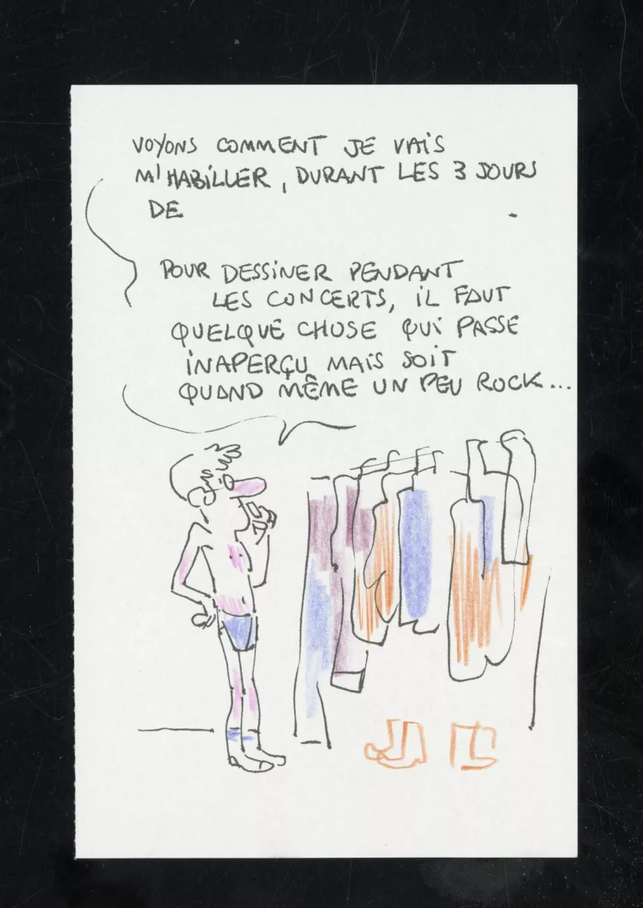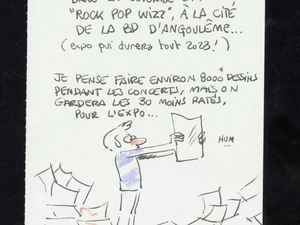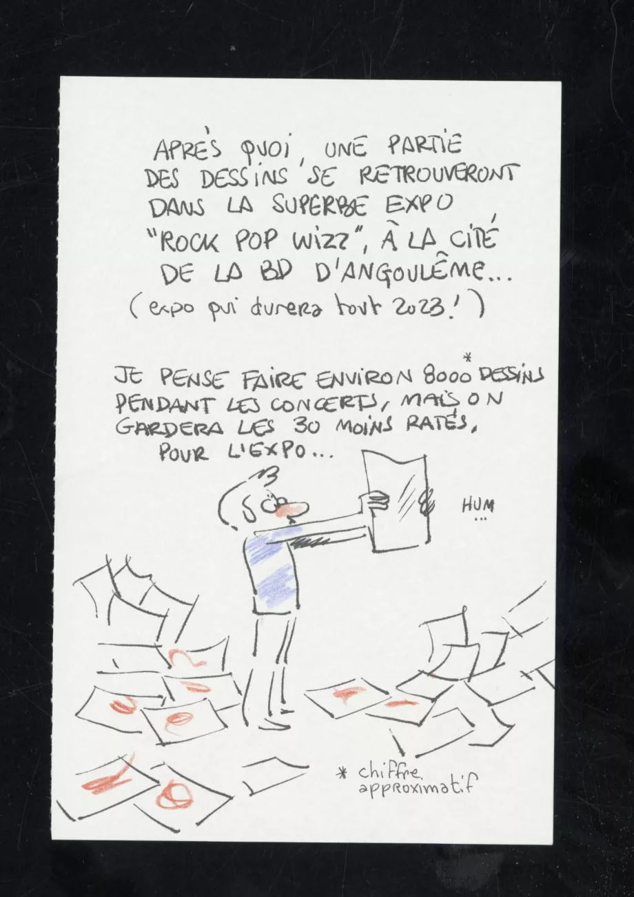 Alfred a ainsi croqué les concerts, les performances, les créations, les rencontres, les masterclasses, les soirées clubbing… dans un journal afin que tout le festival revive sous ses traits de crayons lors de l’exposition « Rock ! Pop ! Wizz ! Quand la BD monte le son » à la Cité de la BD à Angoulême.