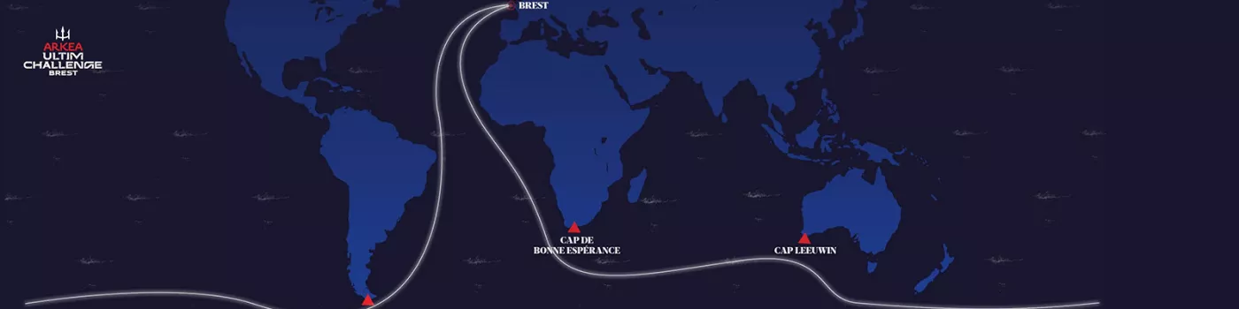 Les 6 skippers à bord de leurs trimarans Ultim passeront par le Cap de Bonne-Espérance, le Cap Leeuwin et le Cap Horn avant de remonter vers Brest. Un défi humain et technologique porté par les marins de la Classe Ultim 32/23 accompagnés de leurs armateurs et partenaires.