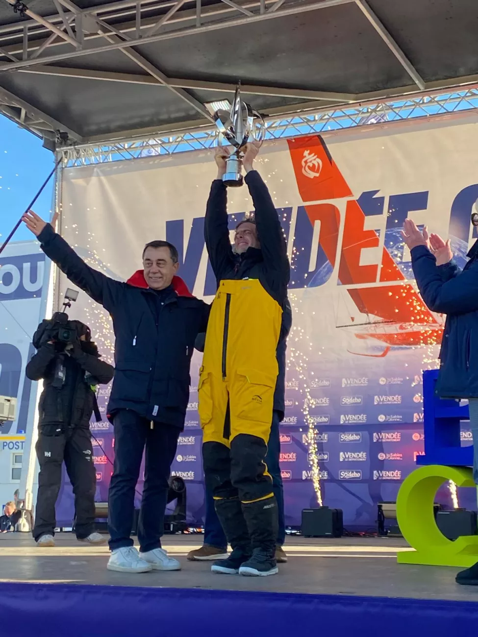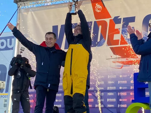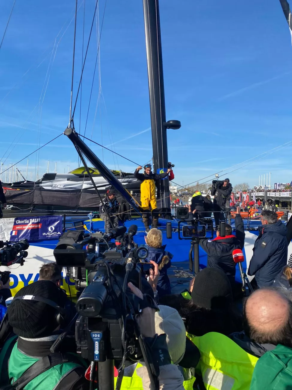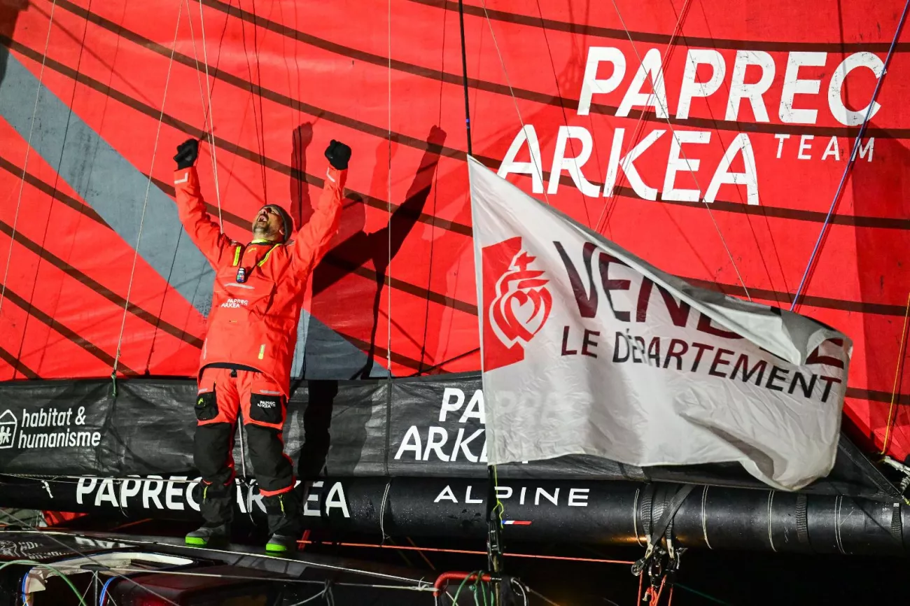 - Yoann Richomme est arrivé 2e, mercredi 15 janvier à 7h12 aux Sables d'Olonne, en 65 jours 18 heures 10 minutes et 2 secondes, soit 22 heures 47 minutes et 13 secondes après Charlie Dalin.