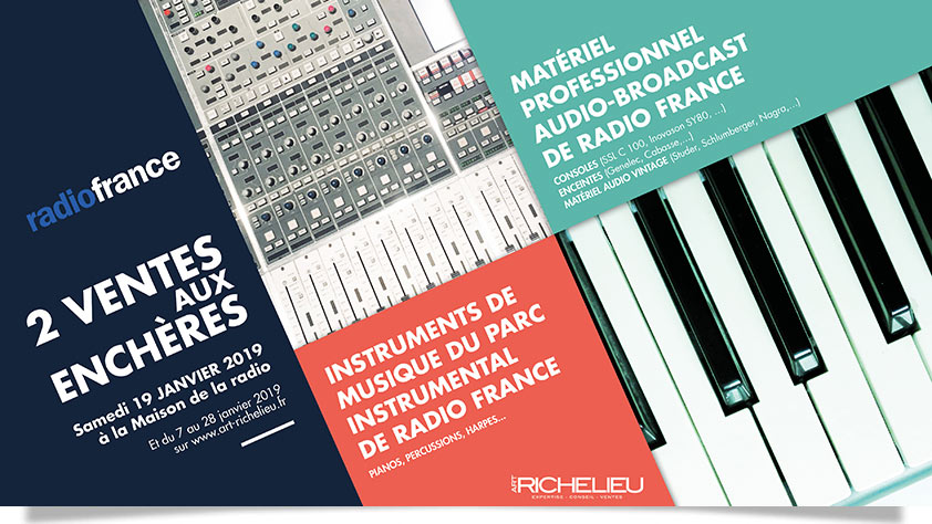 Radio France organise, en collaboration avec Art Richelieu, une double vente aux enchères d'instruments de musique de ses formations musicales et de matériel professionnel technique (consoles, enceintes, matériel audio vintage...). Cette vente s'effectuera à Radio France le 19 janvier 2019 et en ligne tout au long du mois de janvier pour la plupart des instruments.