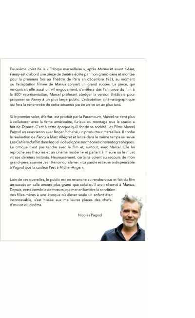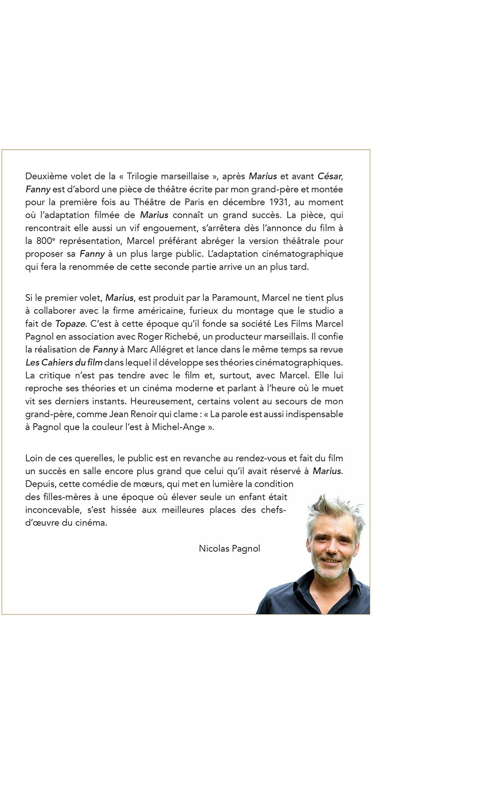 Marius a finalement cédé à ses désirs de voyages et d’évasion. Embarqué sur un navire pour découvrir le monde, il disparaît, abandonnant à quai Fanny, la marchande de coquillages du Vieux-Port de Marseille. La jeune fille, désemparée, apprend alors qu’elle est enceinte. En proie au déshonneur, et poussée par sa mère et par César, le père de Marius, elle accepte la demande en mariage du vieux Panisse, de trente ans son aîné. Mais quelque temps après les noces, Marius réapparaît, guéri de ses rêves de contrées lointaines et désormais prêt à courtiser la belle Fanny…