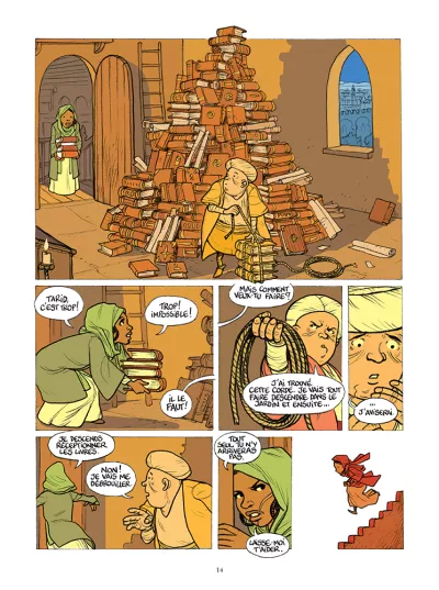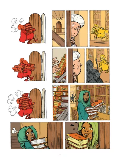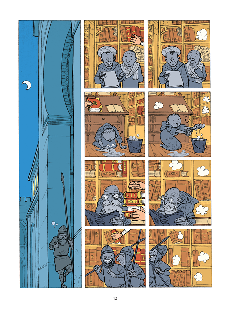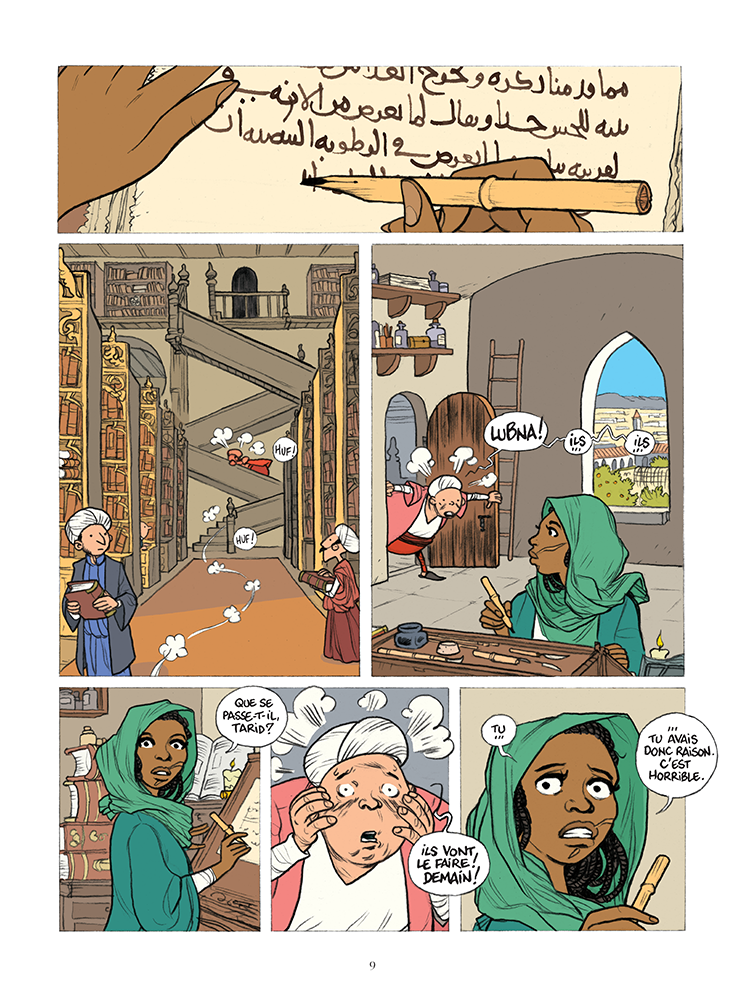 Rejoint par Lubna, la cheffe des copistes, et par Marwan, son ancien apprenti devenu voleur, il entreprend la plus folle des aventures : traverser presque toute l’Espagne avec une “bibliomule” surchargée, poursuivi par des mercenaires berbères.