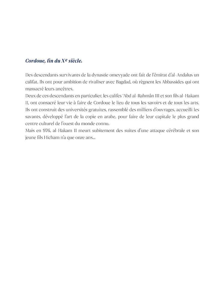 Voilà près de soixante ans que le califat est placé sous le signe de la paix, de la culture et de la science. Le calife Abd el-Rahman III et son fils al-Hakam II ont fait de Cordoue la capitale occidentale du savoir. Mais al-Hakam II meurt jeune, et son fils n’a que dix ans.