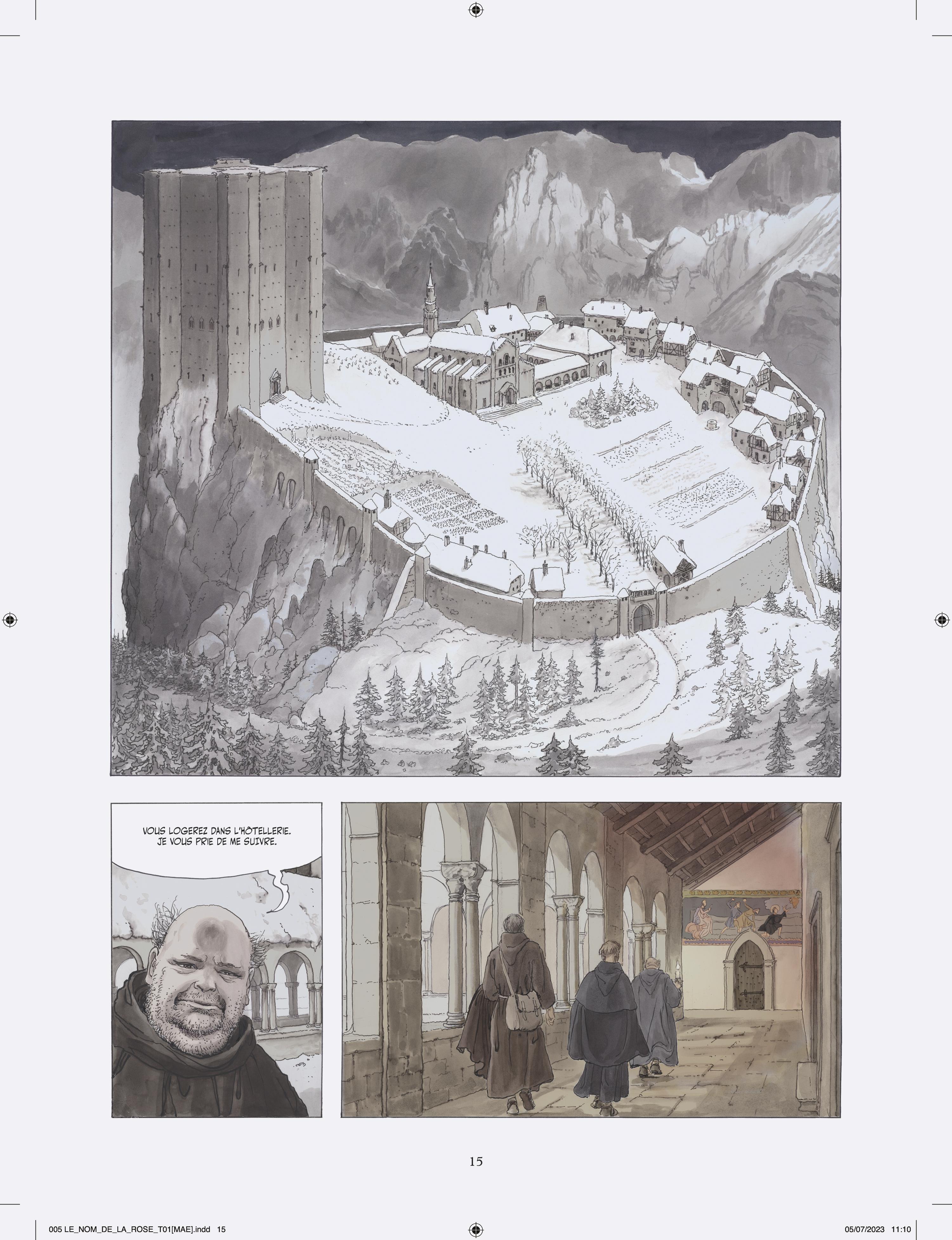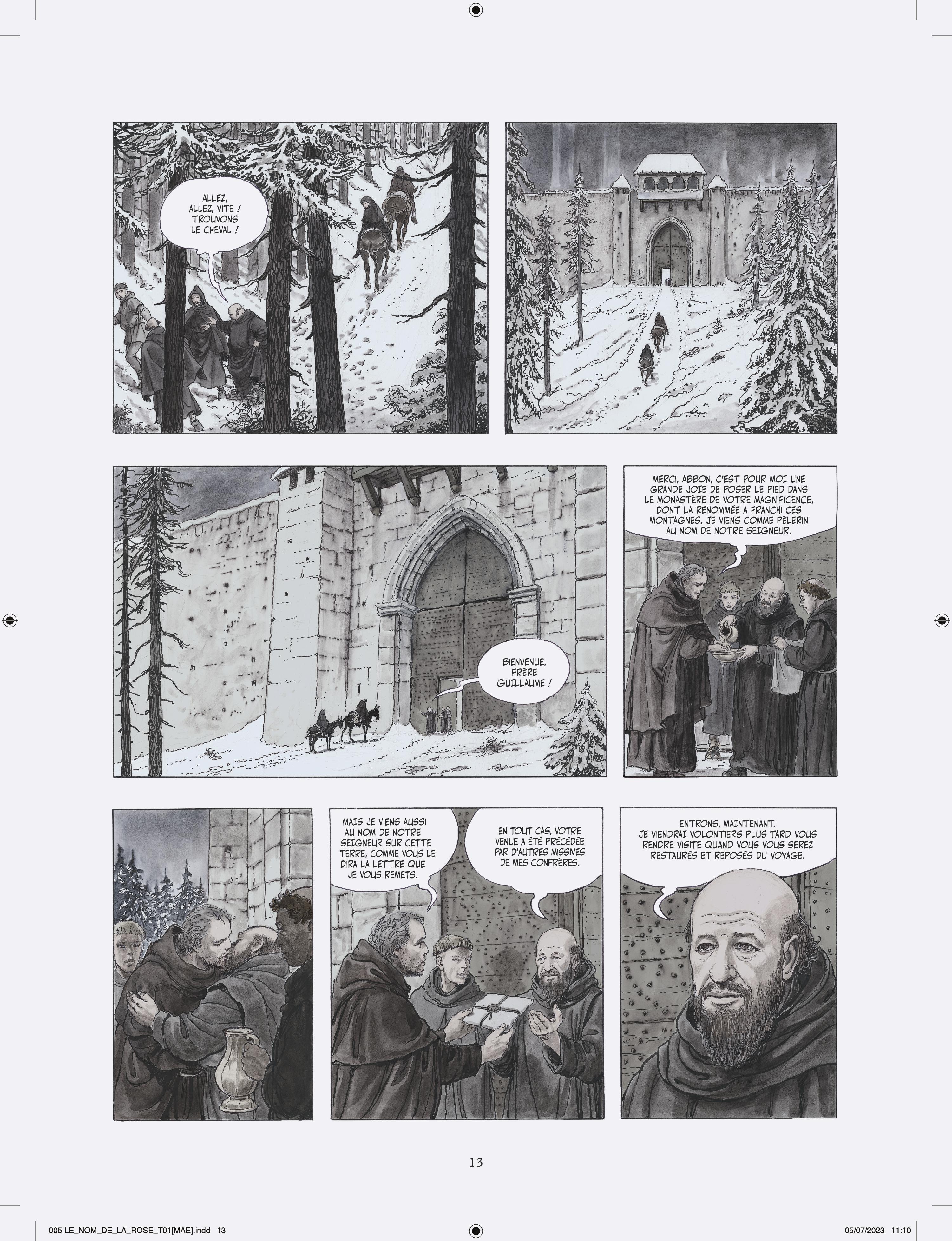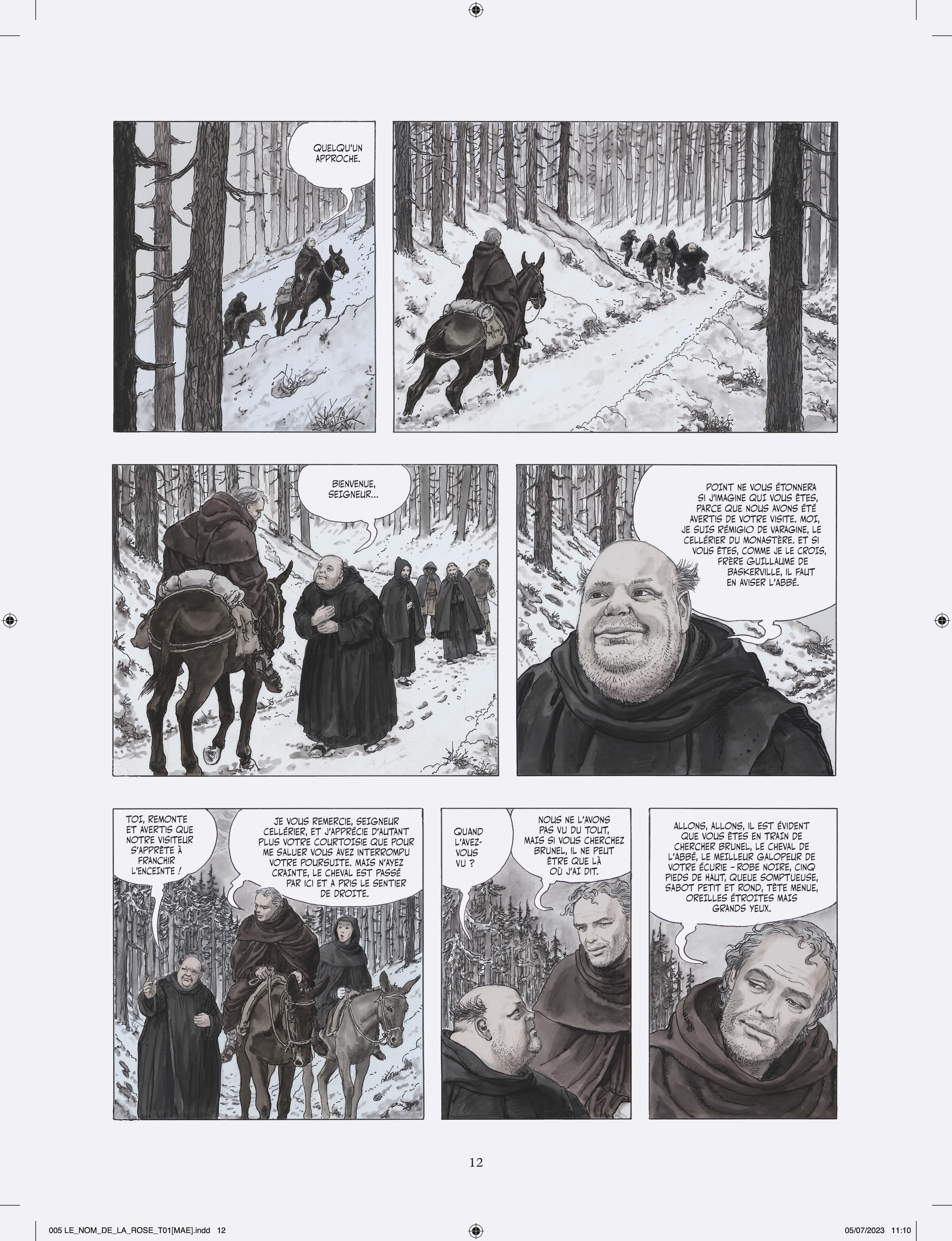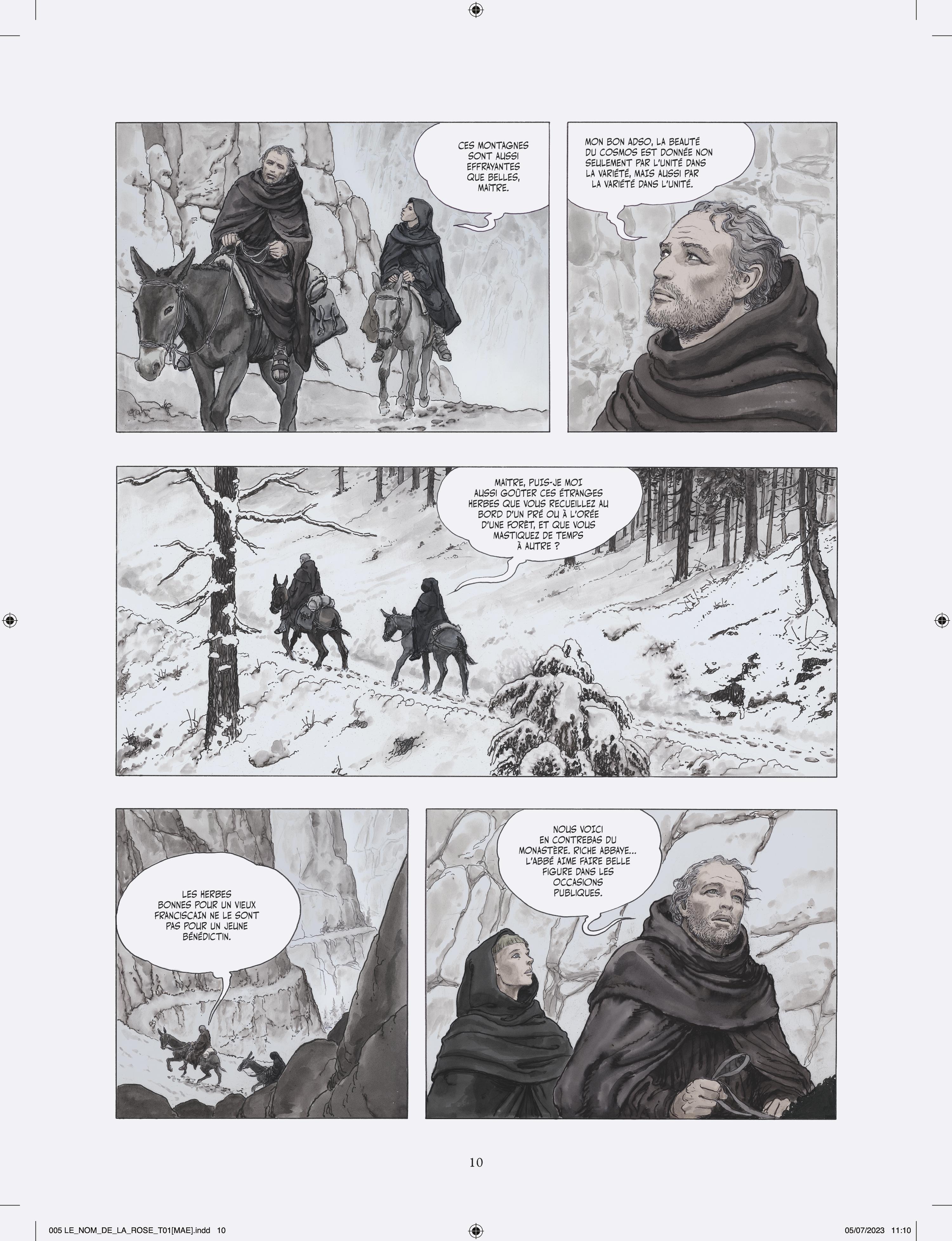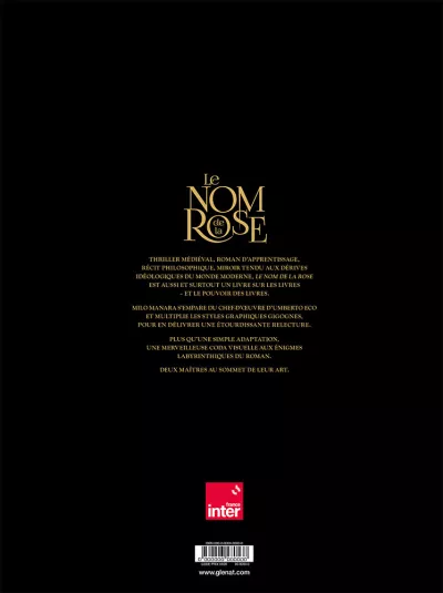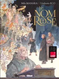 Milo Manara s’attelle à l’adaptation en deux tomes du chef d’œuvre d’Umberto Eco, vendu à plusieurs millions d’exemplaires et traduit en 43 langues. Après Jean-Jacques Annaud au cinéma (1986), c’est un nouvel artiste de prestige qui s’empare du célébrissime polar médiéval. À la demande des héritiers Eco, Manara a eu carte blanche pour donner sa vision de l’œuvre, et a pour cela choisi un triple parti pris graphique très audacieux. Son adaptation s’ouvre en effet sur Umberto Eco lui-même s’adressant au lecteur, dessiné dans un noir et blanc classique. Puis commence l’intrigue médiévale elle-même, et là Manara renoue avec le noir et blanc au lavis, rehaussé d’effets de matières et de modelés qu’il a déjà utilisé pour Le Caravage. Enfin, chacun sait que les livres tiennent un rôle fondamental dans l’intrigue, et Manara s’amuse donc de temps à autre à recréer des enluminures d’époque, réalisées à la manière des moines copistes du Moyen Âge. L’ensemble est mis en couleurs par la propre fille de Manara sous la supervision de son père, là aussi selon la même méthode qui a présidé à la réalisation du Caravage.