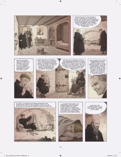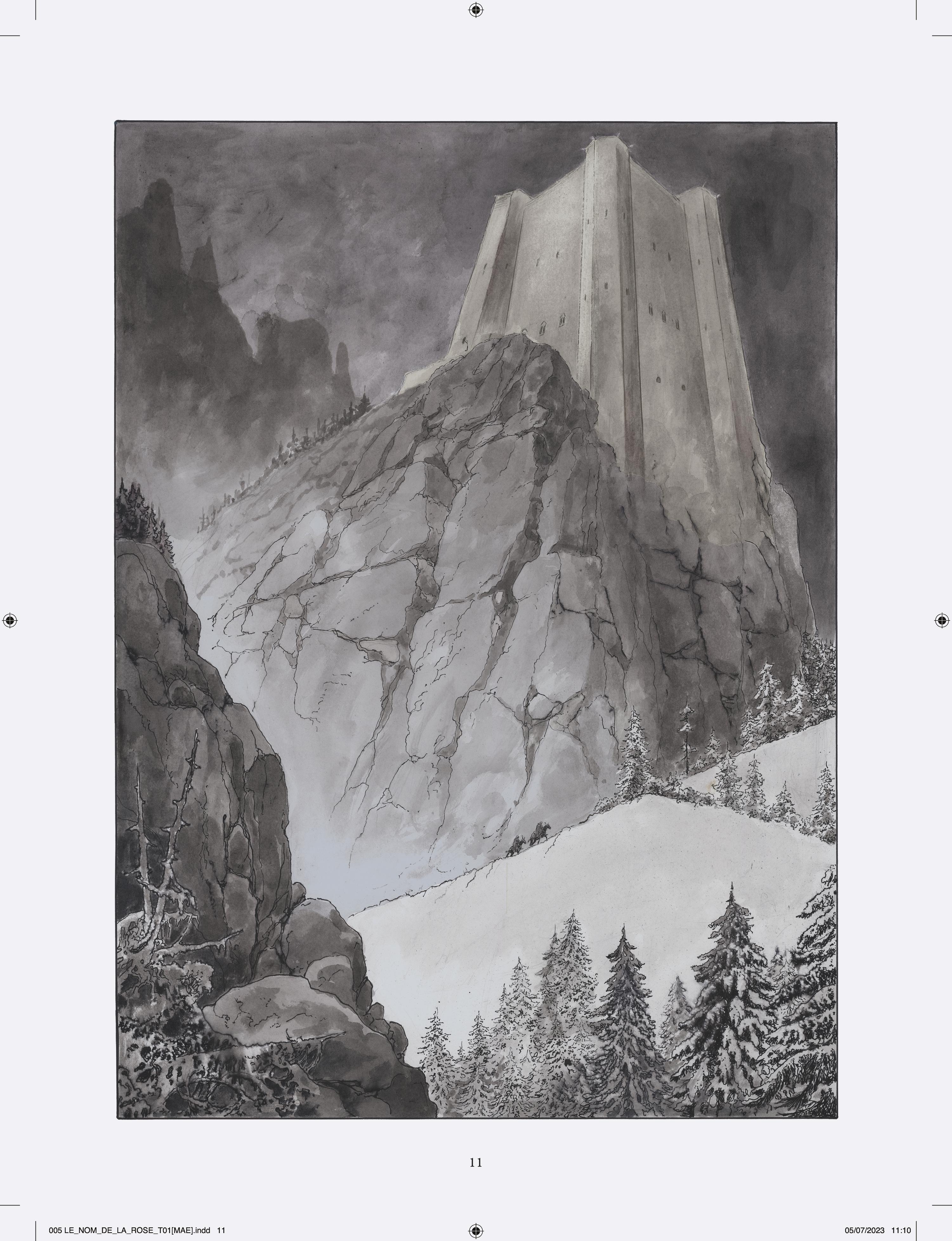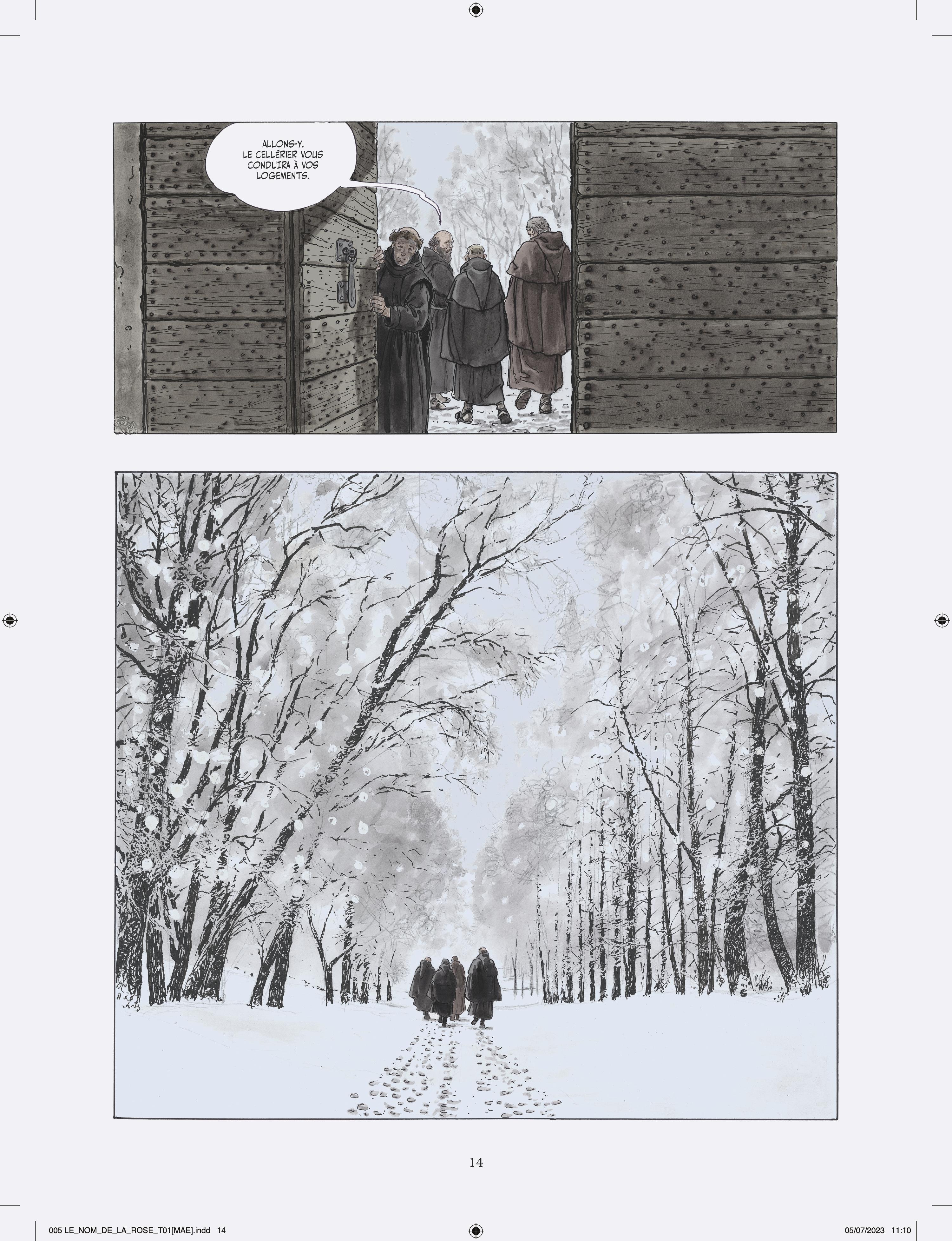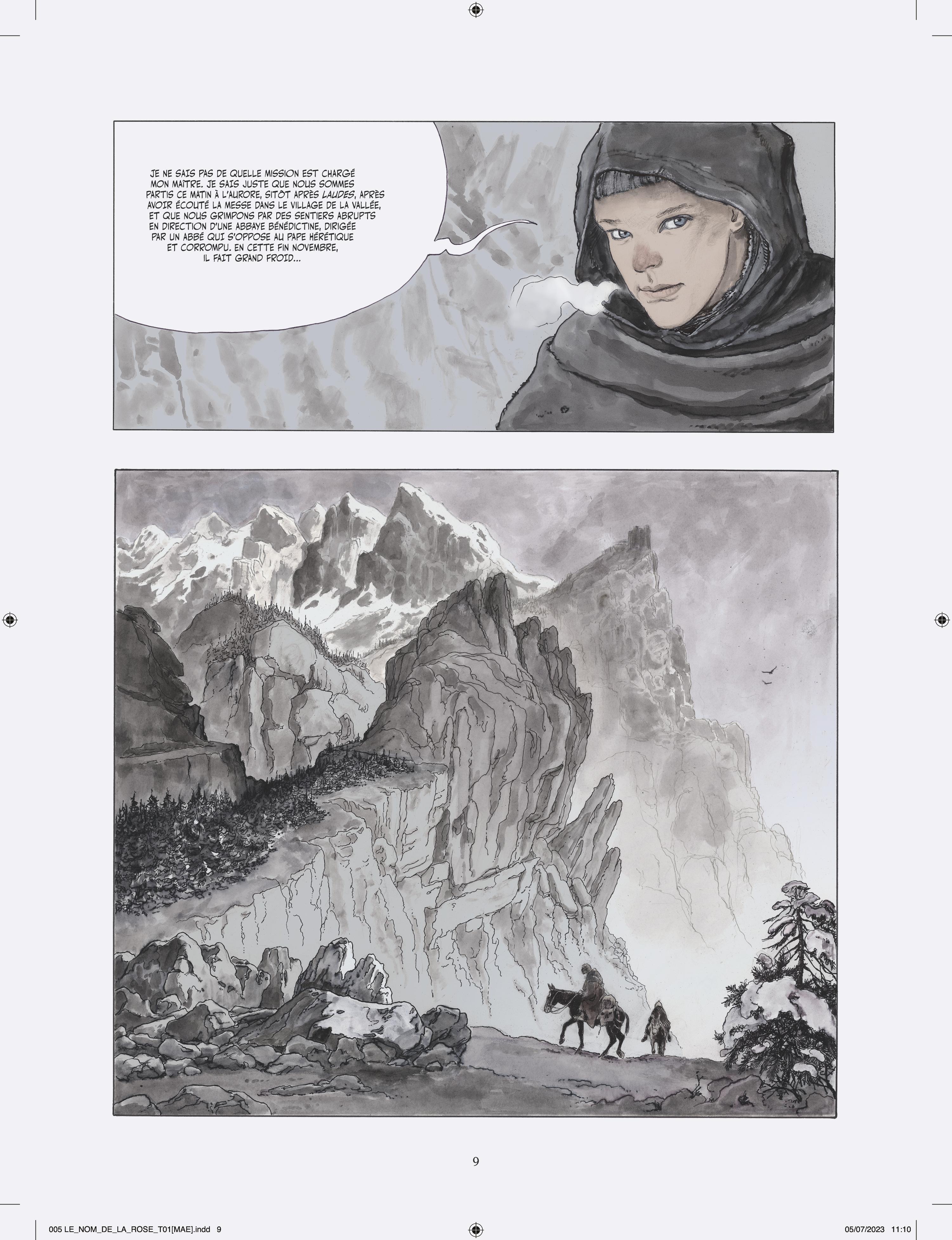 Milo Manara s’attelle à l’adaptation en deux tomes du chef d’œuvre d’Umberto Eco, vendu à plusieurs millions d’exemplaires et traduit en 43 langues. Après Jean-Jacques Annaud au cinéma (1986), c’est un nouvel artiste de prestige qui s’empare du célébrissime polar médiéval. À la demande des héritiers Eco, Manara a eu carte blanche pour donner sa vision de l’œuvre, et a pour cela choisi un triple parti pris graphique très audacieux. Son adaptation s’ouvre en effet sur Umberto Eco lui-même s’adressant au lecteur, dessiné dans un noir et blanc classique. Puis commence l’intrigue médiévale elle-même, et là Manara renoue avec le noir et blanc au lavis, rehaussé d’effets de matières et de modelés qu’il a déjà utilisé pour Le Caravage. Enfin, chacun sait que les livres tiennent un rôle fondamental dans l’intrigue, et Manara s’amuse donc de temps à autre à recréer des enluminures d’époque, réalisées à la manière des moines copistes du Moyen Âge. L’ensemble est mis en couleurs par la propre fille de Manara sous la supervision de son père, là aussi selon la même méthode qui a présidé à la réalisation du Caravage.