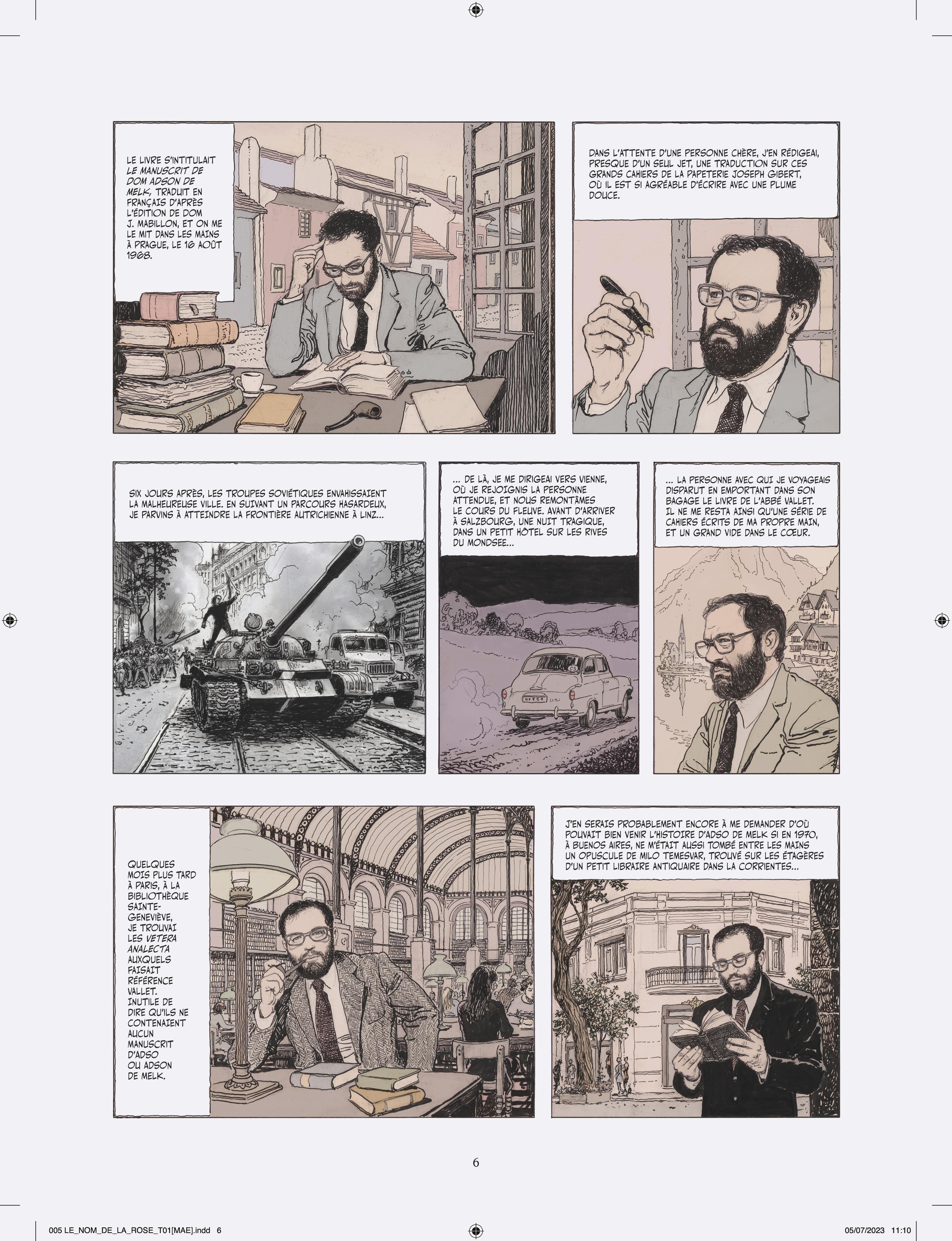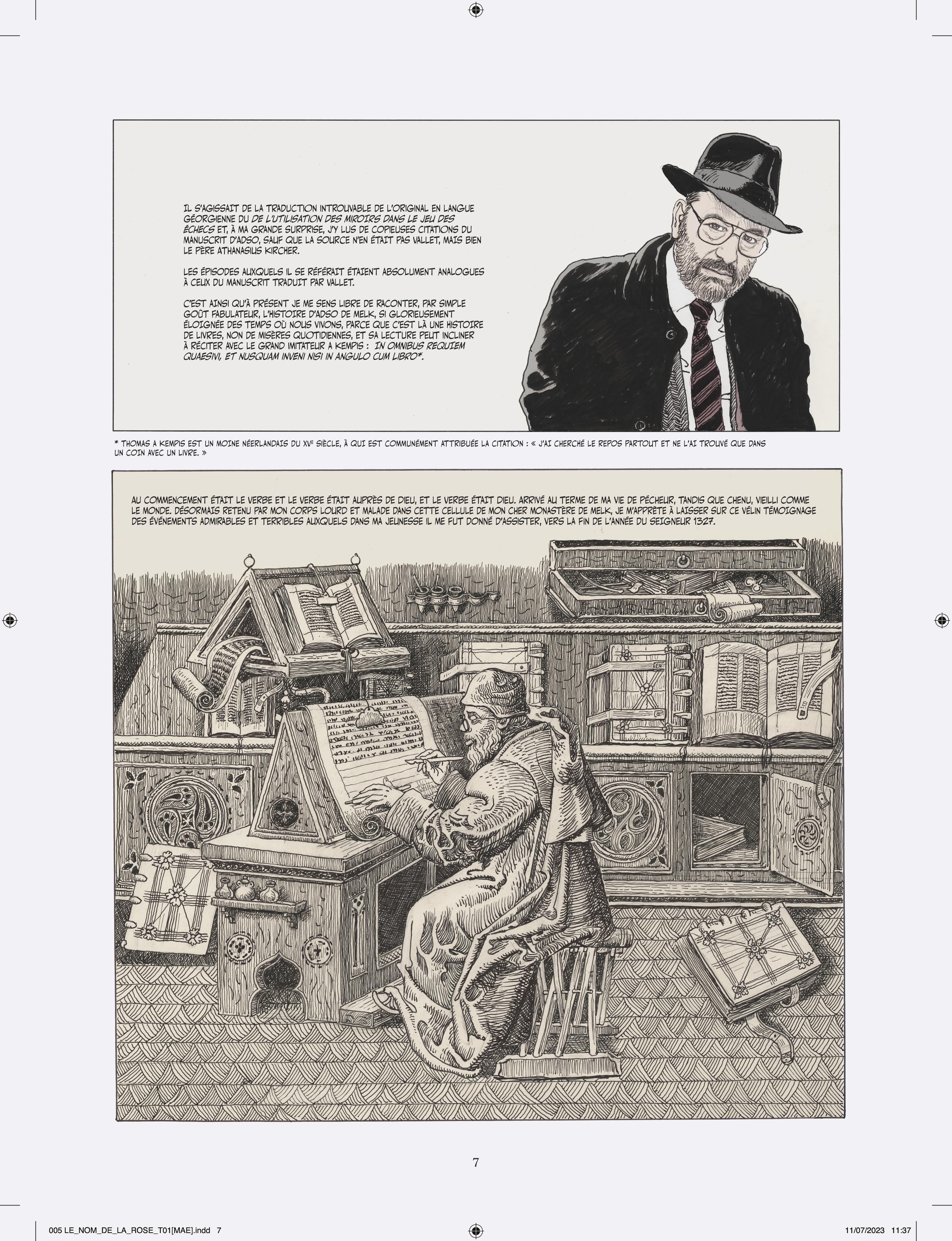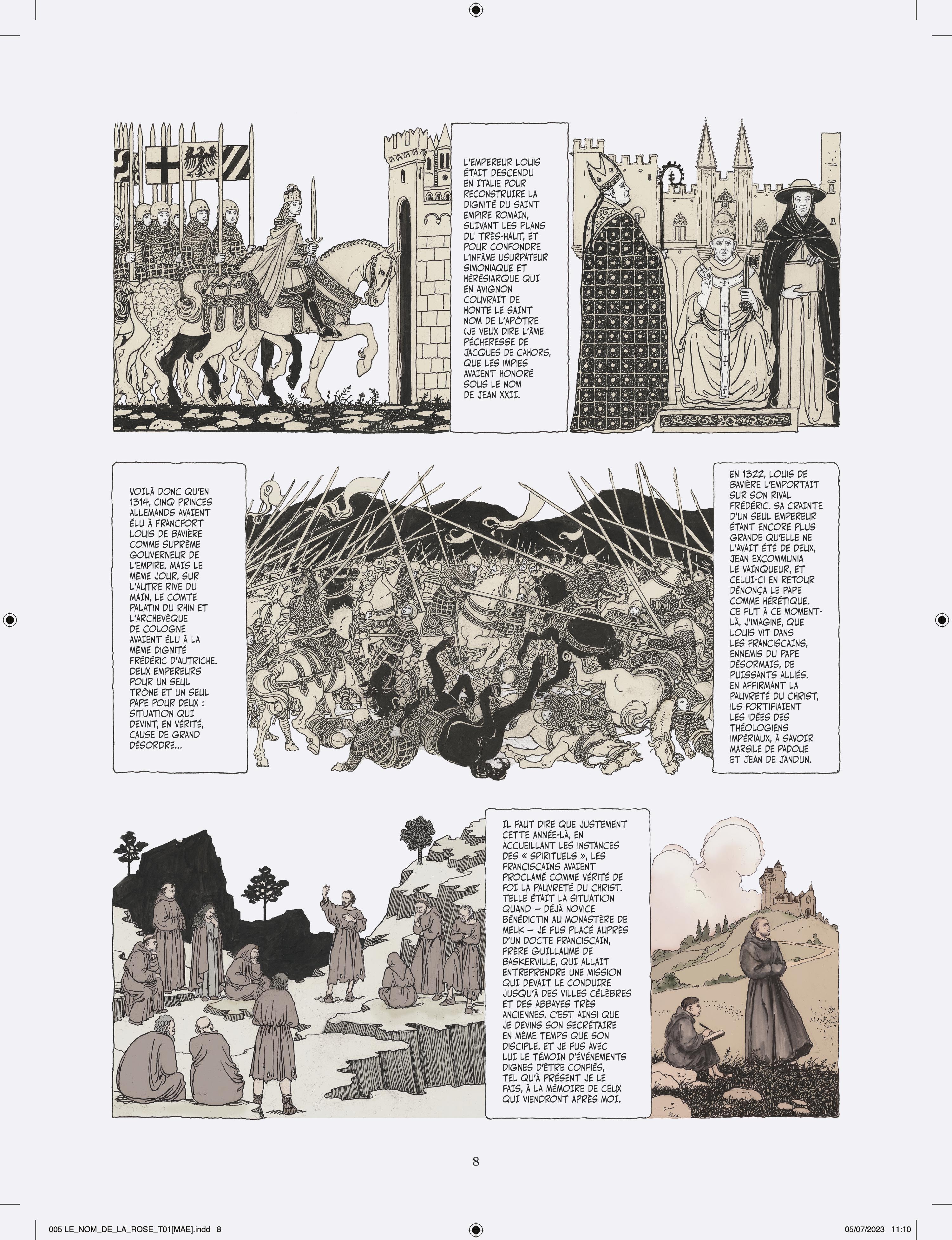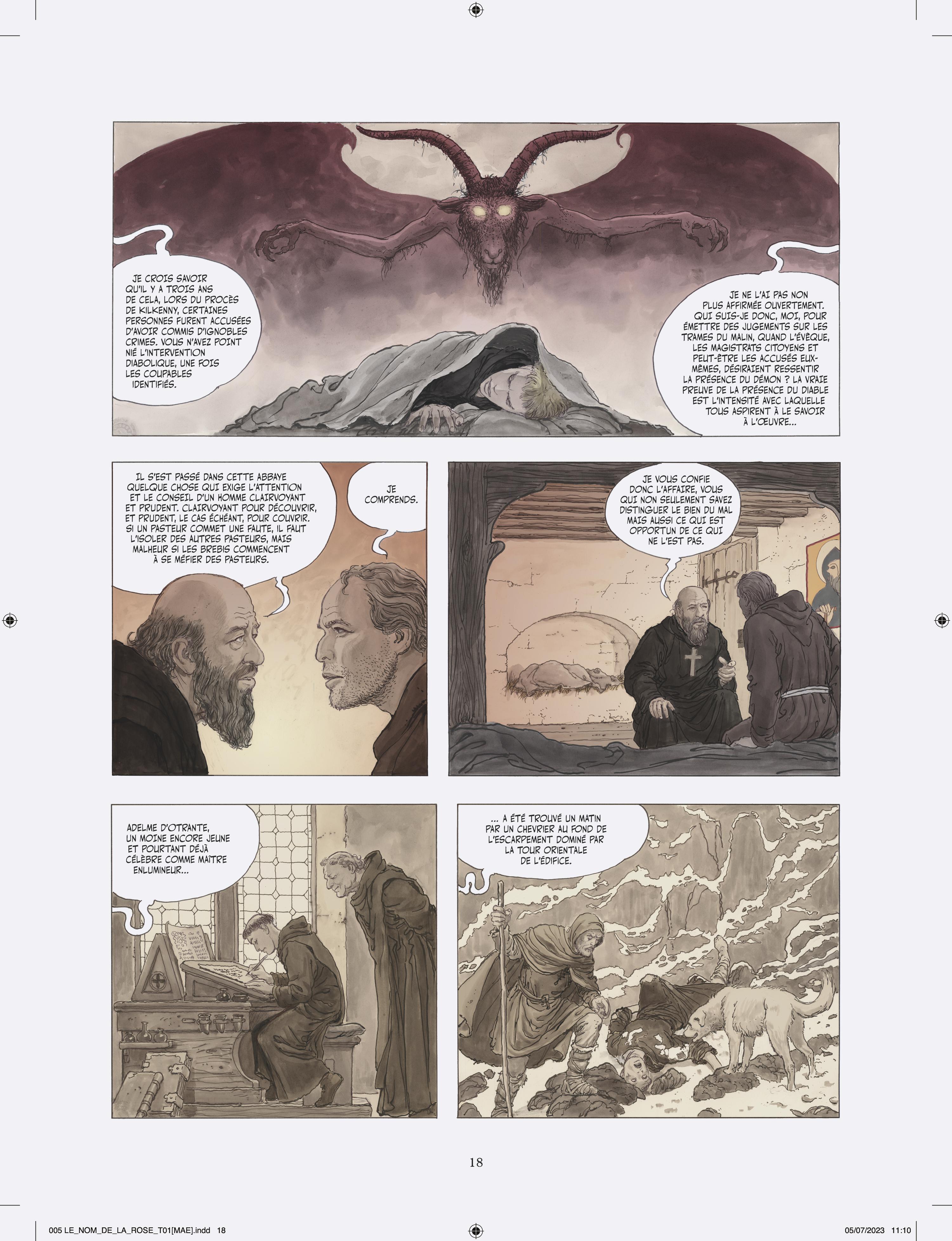 Milo Manara s’attelle à l’adaptation en deux tomes du chef d’œuvre d’Umberto Eco, vendu à plusieurs millions d’exemplaires et traduit en 43 langues. Après Jean-Jacques Annaud au cinéma (1986), c’est un nouvel artiste de prestige qui s’empare du célébrissime polar médiéval. À la demande des héritiers Eco, Manara a eu carte blanche pour donner sa vision de l’œuvre, et a pour cela choisi un triple parti pris graphique très audacieux. Son adaptation s’ouvre en effet sur Umberto Eco lui-même s’adressant au lecteur, dessiné dans un noir et blanc classique. Puis commence l’intrigue médiévale elle-même, et là Manara renoue avec le noir et blanc au lavis, rehaussé d’effets de matières et de modelés qu’il a déjà utilisé pour Le Caravage. Enfin, chacun sait que les livres tiennent un rôle fondamental dans l’intrigue, et Manara s’amuse donc de temps à autre à recréer des enluminures d’époque, réalisées à la manière des moines copistes du Moyen Âge. L’ensemble est mis en couleurs par la propre fille de Manara sous la supervision de son père, là aussi selon la même méthode qui a présidé à la réalisation du Caravage.