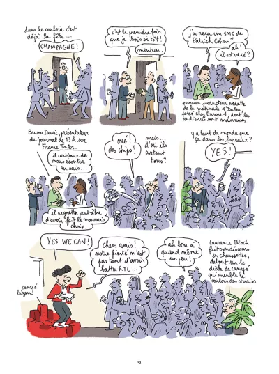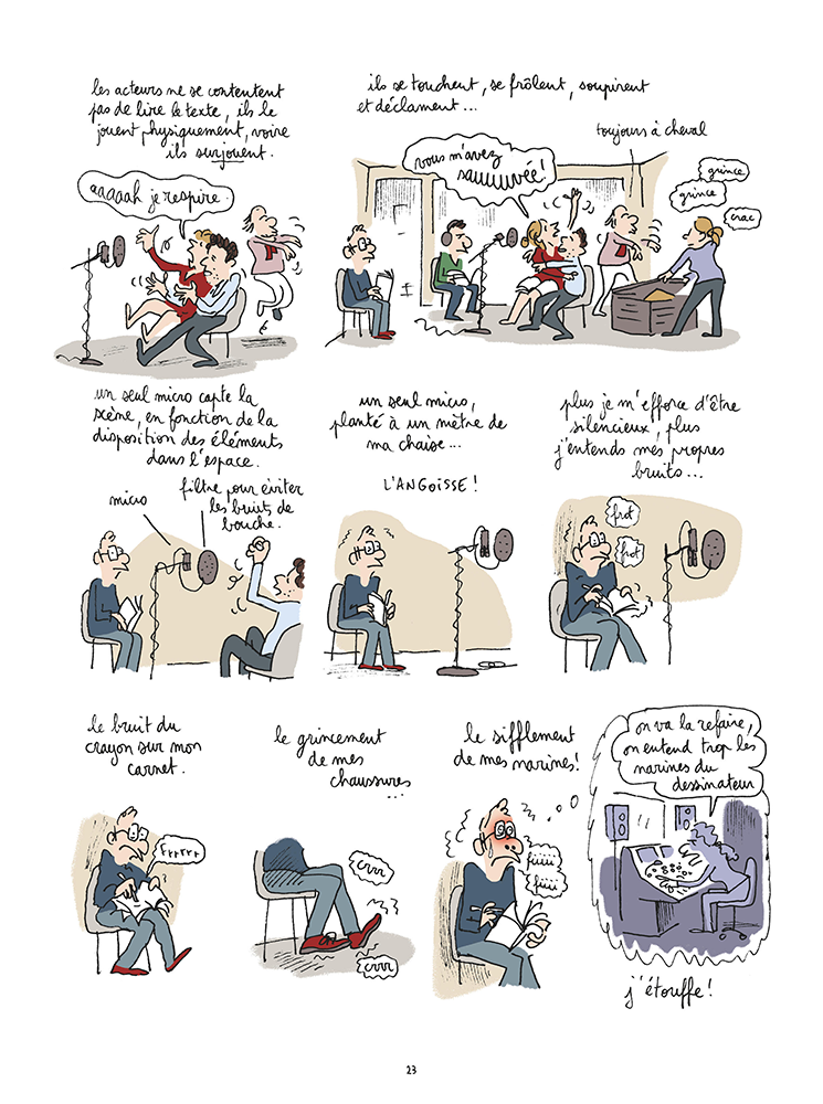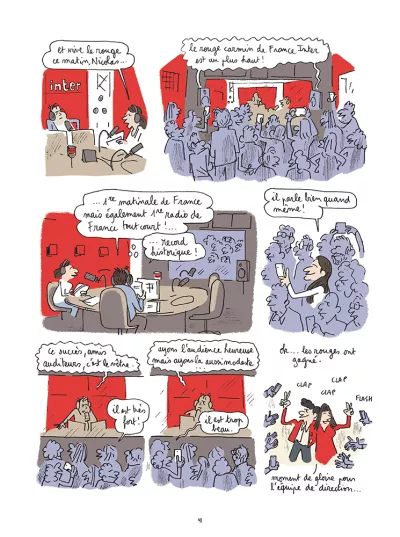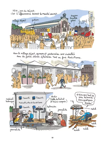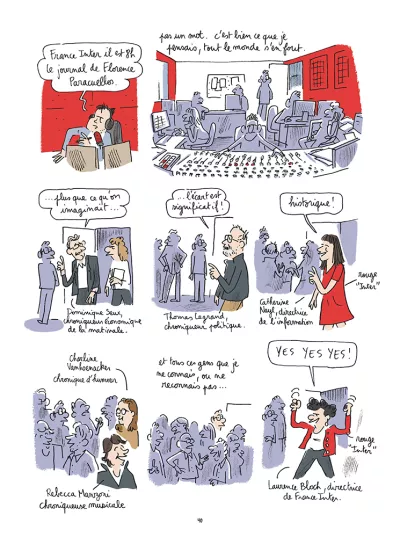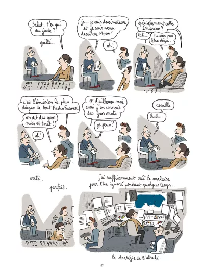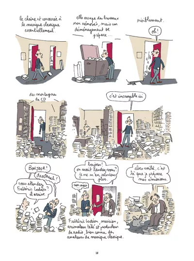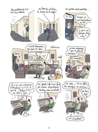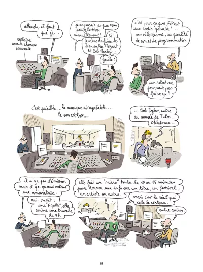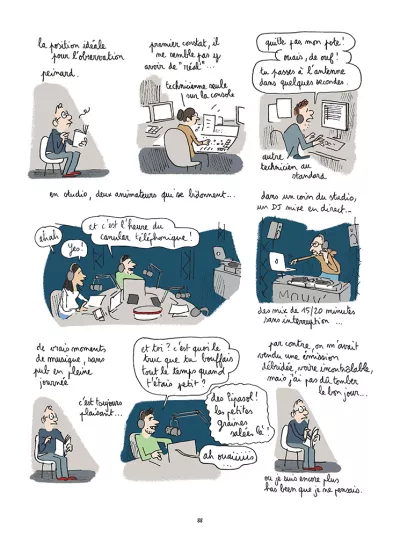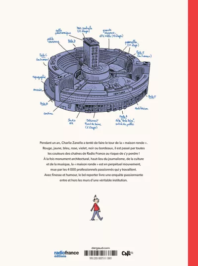 Après avoir raconté sa vie de libraire au Centre Pompidou-Metz, Charlie Zanello s’intéresse à un autre monument emblématique de notre patrimoine architectural et culturel. Adepte d’un dessin enlevé qui évoque autant Bretécher que Wolinski, il mêle curiosité, sens de l’observation, humour et autodérision pour lever le voile sur un temple de la culture et de l’information aussi renommé que mystérieux. Tour à tour candide et sûr de lui, à l’écoute des gens et émerveillé par les prouesses technologiques d’un lieu dans lequel il s’est immergé durant une année, il nous emmène à la rencontre des journalistes vedettes de la radio publique comme de tous les inconnus grâce auxquels la Maison ronde ne cesse jamais de tourner, du technicien à l’assistante de réalisation et du producteur au documentaliste. Sans oublier le fantôme qui l’oriente dans ses pérégrinations... Un reportage passionnant qui s’autorise quelques excursions en extérieur sur la route du Tour de France ou lors de l’enregistrement du Jeu des 1000 euros et qui rend hommage à la richesse de notre radio publique.