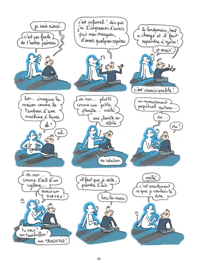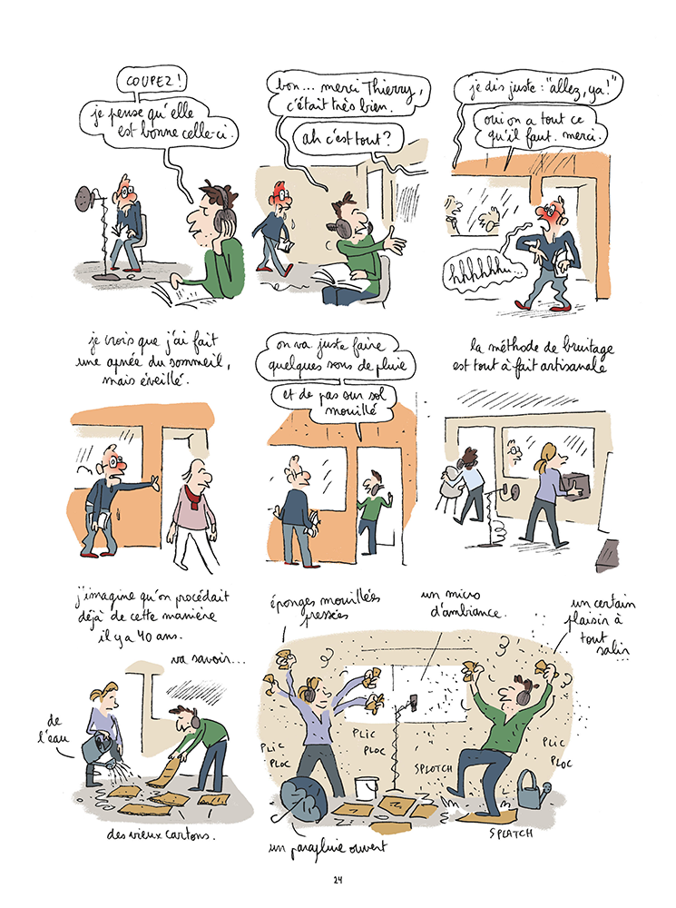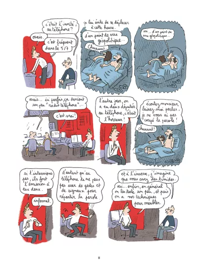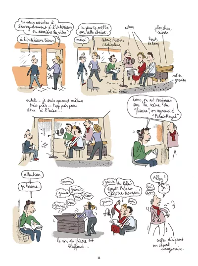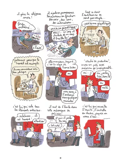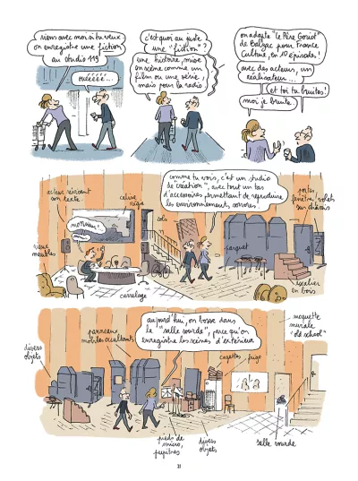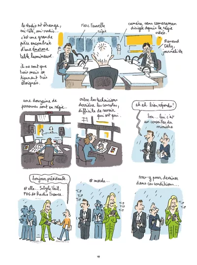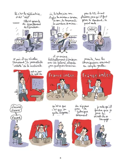 L’intrépide Charlie Zanello, muni d’un carnet à dessin et d’un crayon, a joué le petit reporter au cœur de la Maison ronde. De jour comme de nuit, il a poussé des portes, assisté à de nombreuses émissions et rencontré bon nombre des 4 000 professionnels qui y travaillent. Il a arpenté d’interminables couloirs – « on marche tout le temps, on monte, on descend, on tourne [...] » –, il s’est parfois perdu, il a découvert des abris atomiques et des endroits étranges, comme le « centre distributeur de modulations » comparable au tambour d’une machine à laver ou encore à l’œil d’un cyclone...