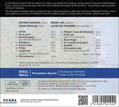This first album by the Pernambuco Quartet is a magnificent journey through the music of Pernambuco, from the quays of Recife to the sertão, from the city to the arid hinterland, carried by the voice of Antônio Marinho, the flute of César Michiles, the guitar of Breno Lira, the percussion of Lucas dos Prazeres and their shared inspiration.
