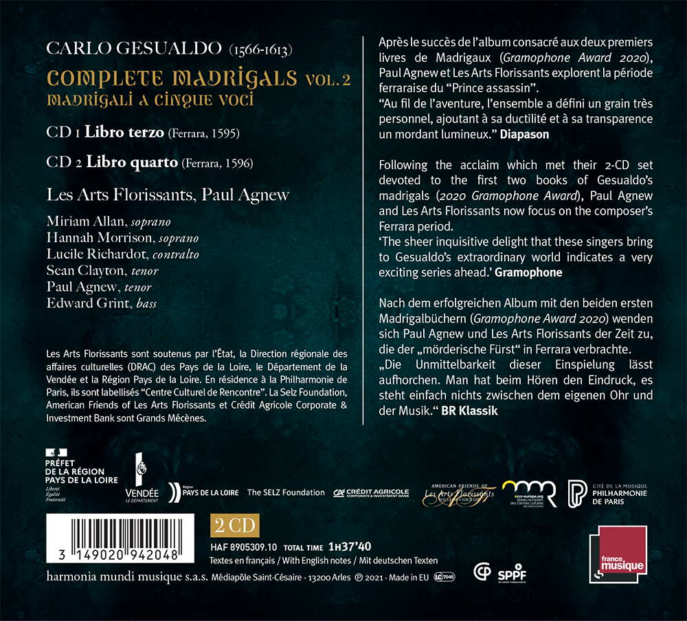 Following the acclaim which met their 2-CD set devoted to the first two books of Gesualdo’s madrigals (2020 Gramophone Award), Paul Agnew and Les Arts Florissants now focus on the composer’s Ferrara period.