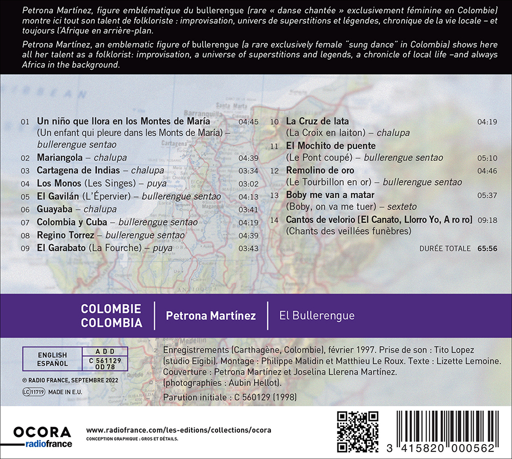 Petrona Martínez, figure emblématique du bullerengue (rare « danse chantée » exclusivement féminine en Colombie) montre ici tout son talent de folkloriste : improvisation, univers de superstitions et légendes, chronique de la vie locale – et toujours l’Afrique en arrière-plan.