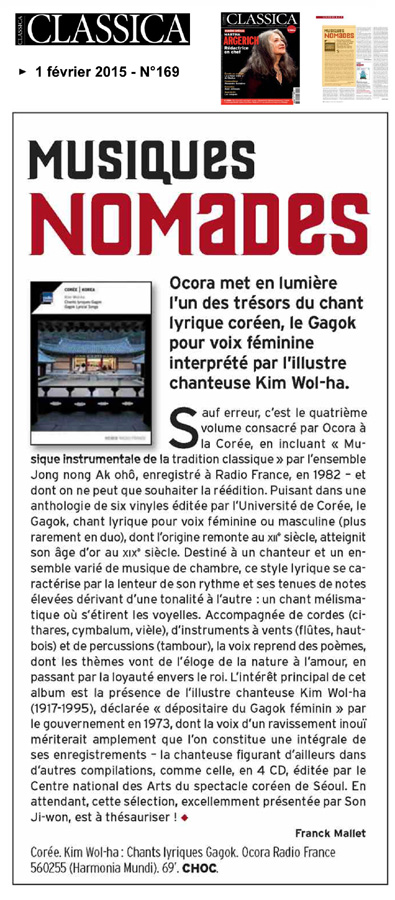Genre millénaire de chant lyrique adapté aux poèmes sijo, combinaison complète entre voix et accompagnement de musique de chambre, le gagok est ici interprété par la très célèbre chanteuse Kim Wol-ha : chant mélismatique, maîtrise du souffle, musique éthérée.