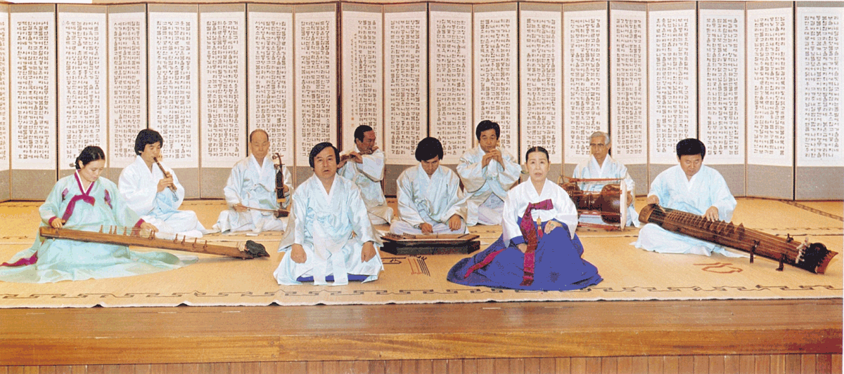Kim Sung-jin, flûte daegeum / Kim Sun-han, cithare geomungo / Chung Jae-gook, hautbois piri / Kim Jae-woon, cymbalum yanggeum / Hong Jong-jin, flûte danso / Kim Cheon-hong, vièle haegeum / Kim Jeong-ja, cithare gayageum / Kim Tae-seop, tambour janggu.