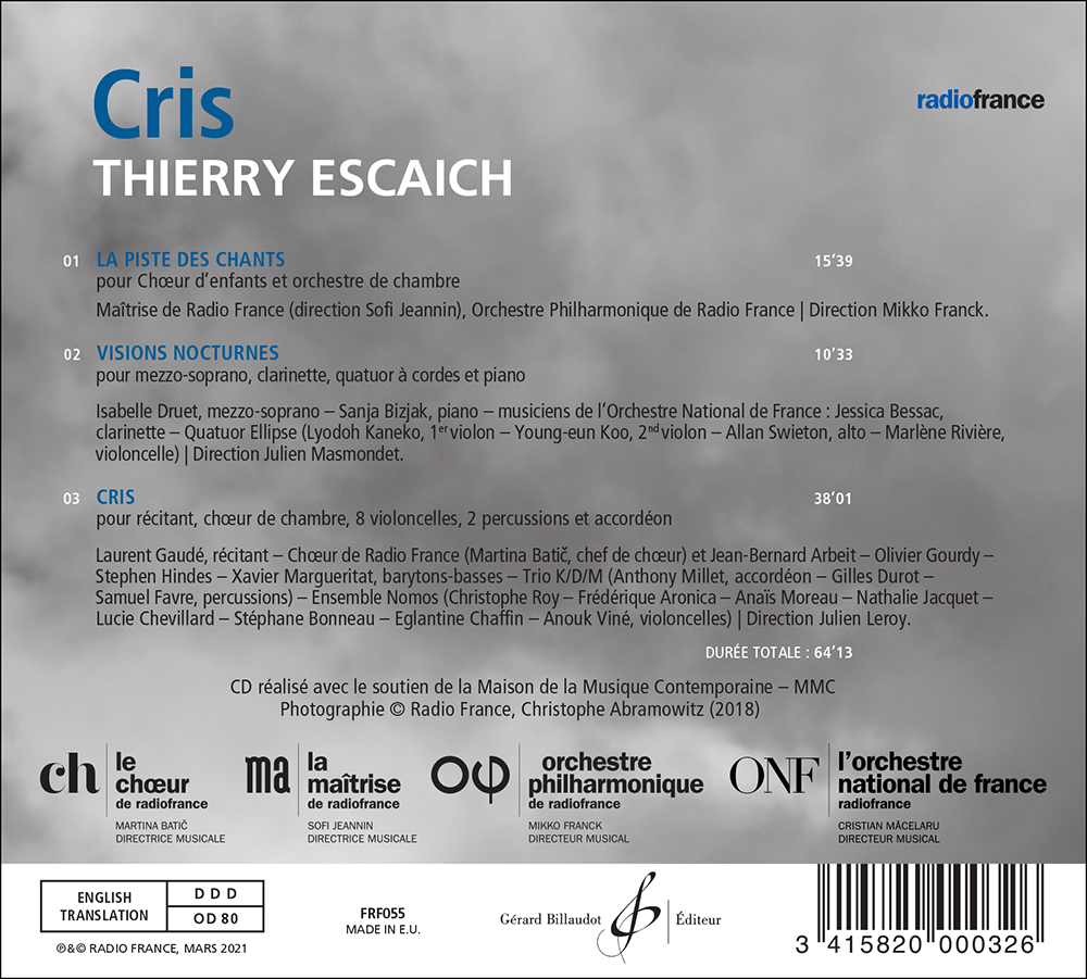 La base orchestrale de « Cris » est un ensemble formé par deux percussionnistes et un accordéon. La présence d’un groupe de 8 violoncelles répond au récitant et la possibilité d’un lyrisme noir s’est imposée pour cette commémoration d'une bataille.