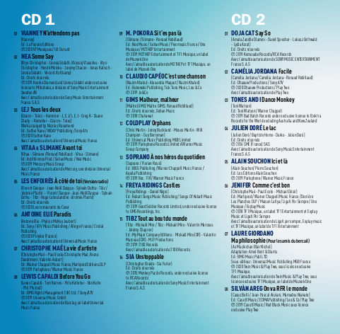 Gims, M. Pokora, Jenifer, Vitaa et Slimane, Doja Cat, Camélia Jordana, Nea, Christophe Maé, Lej, Soprano, Alain Souchon, Les enfoirés, Zazie, Chic, Kim Carnes, Trois cafés gourmands...