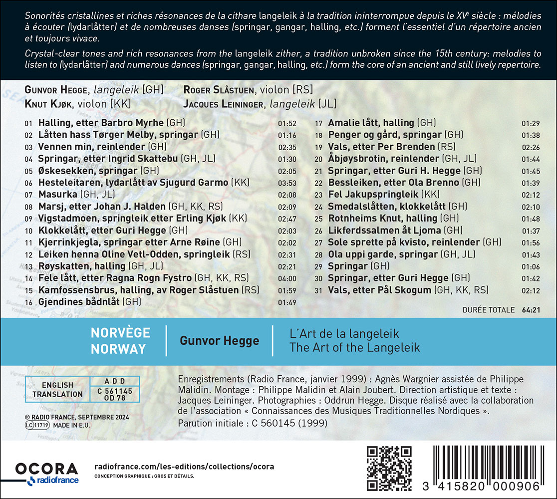 Crystal-clear tones and rich resonances from the langeleik zither, a tradition unbroken since the 15th century: melodies to listen to (lydarlåtter) and numerous dances (springar, gangar, halling, etc.) form the core of an ancient and still lively repertoire.