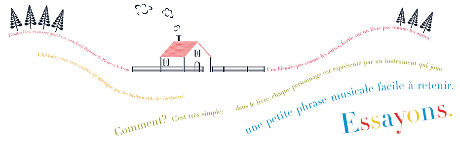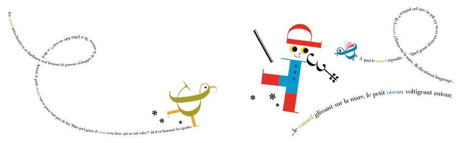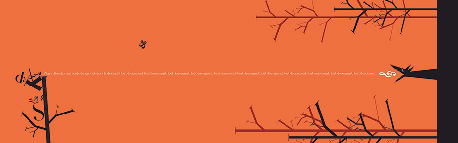 Un livre avec des découpes et de grandes pages qui se déploient, tantôt comme une forêt, tantôt comme la gueule menaçante du loup. On y retrouve nos personnages tout en typographie (le corps du canard est une esperluète, la casquette de Pierre est un « P »…).