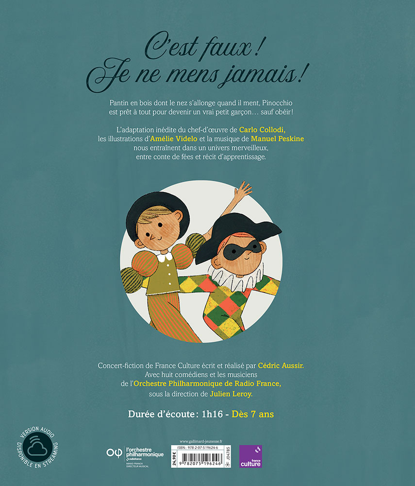 L'adaptation de Cédric Aussir, la composition de Manuel Peskine et les magnifiques illustrations d'Amélie Videlo nous embarquent dans cette aventure haute en couleur ! Avec 8 comédiens (dont Rufus dans le rôle de Gepetto) et l'Orchestre Philharmonique de Radio France. France Culture est à l'origine du concept des concerts-fiction, des créations de grande envergure avec les deux orchestres de Radio France.