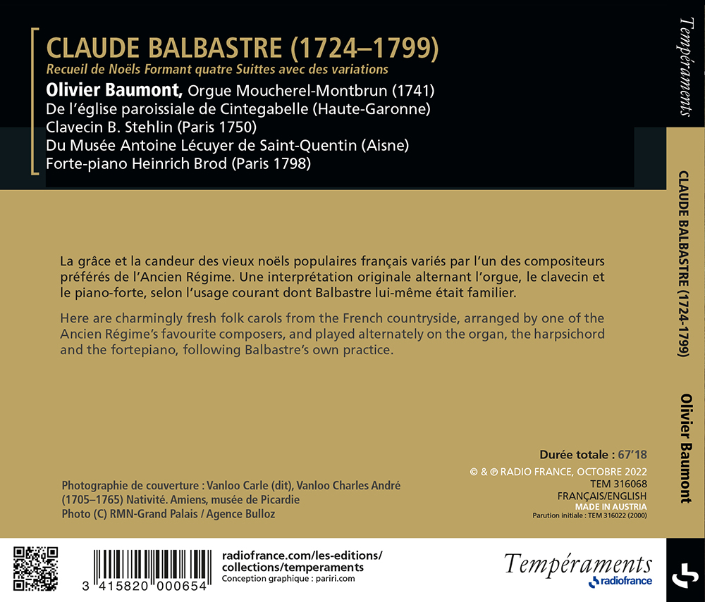 La grâce et la candeur des vieux noëls populaires français variés par l’un des compositeurs préférés de l’Ancien Régime. Une interprétation originale alternant l’orgue, le clavecin et le piano-forte, selon l’usage courant dont Balbastre lui-même était familier.