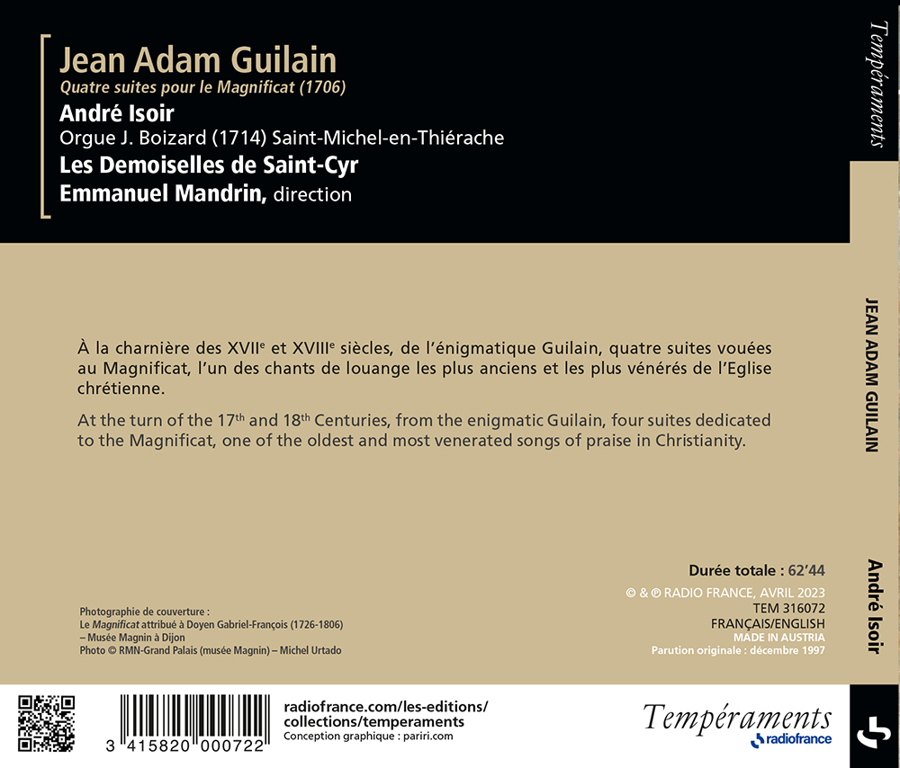 À la charnière des XVIIe et XVIIIe siècles, de l'énigmatique Guilain, quatre suites vouées au Magnificat, l'un des chants de louange les plus anciens et les plus vénérés de l'Église chrétienne.