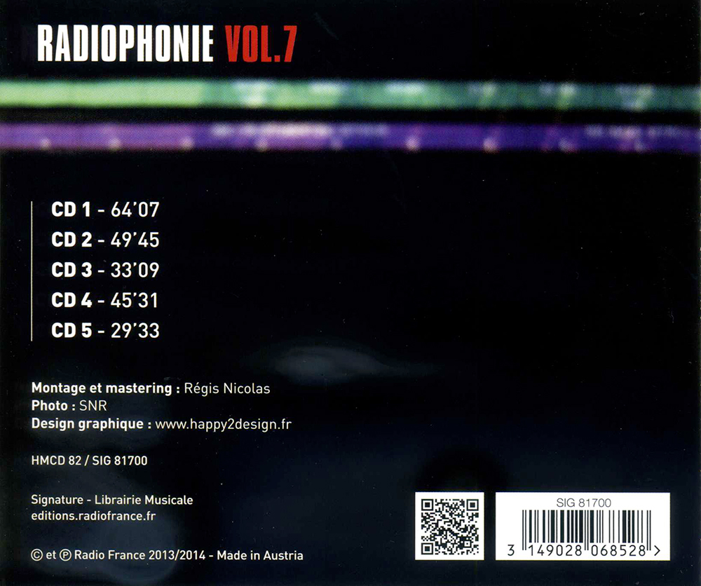 CD 1 / 64’07 FRANCE INTER / FRANCE CULTURE / FRANCE BLEU - CD 2 / 49’45 FRANCE INTER - CD 3 / 33’09 FRANCE MUSIQUE / FRANCE CULTURE / FRANCE BLEU - CD 4 / 45’31 FRANCE INFO - CD 5 / 29433 FRANCE INFO