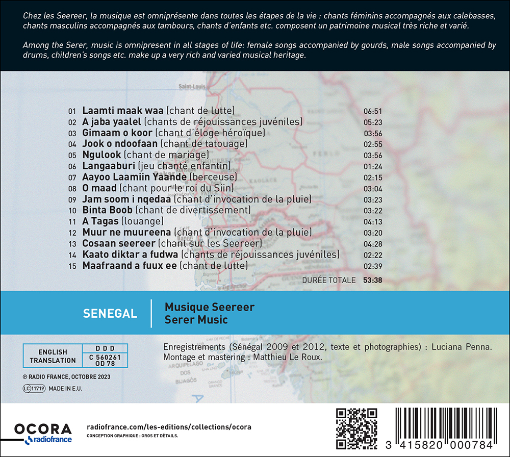 Chez les Seereer, la musique est omniprésente dans toutes les étapes de la vie : chants féminins accompagnés aux calebasses, chants masculins accompagnés aux tambours, chants d’enfants etc. composent un patrimoine musical très riche et varié.