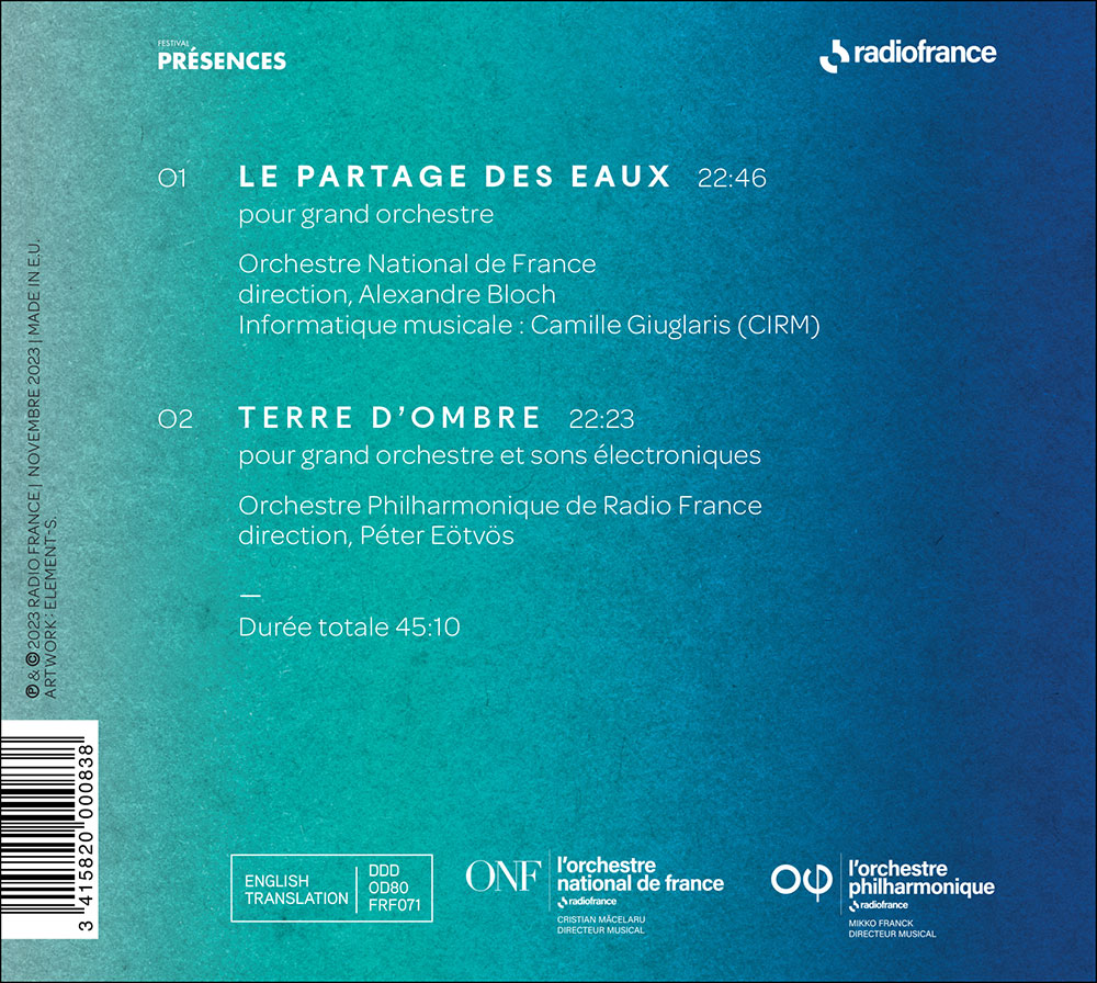 Orchestre National de France, dirigé par Alexandre Bloch / Camille Giuglaris, informatique musicale. - « Terre d’ombre »