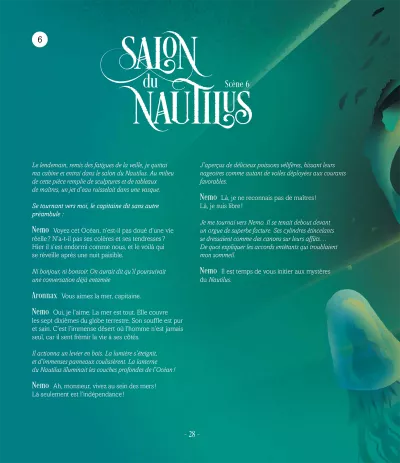 Comédiens : PROFESSEUR ARONNAX : Gabriel Dufay | CONSEIL : Sylvain Levitte | NED LAND : Clément Bresson | CAPITAINE NEMO : Eriq Ebouaney | COPILOTE : Antoine Sastre | Solistes : Marie-Cécile Hebert, Irène Meila Buttin, Alexandrine Monnot, Clémence Vidal.