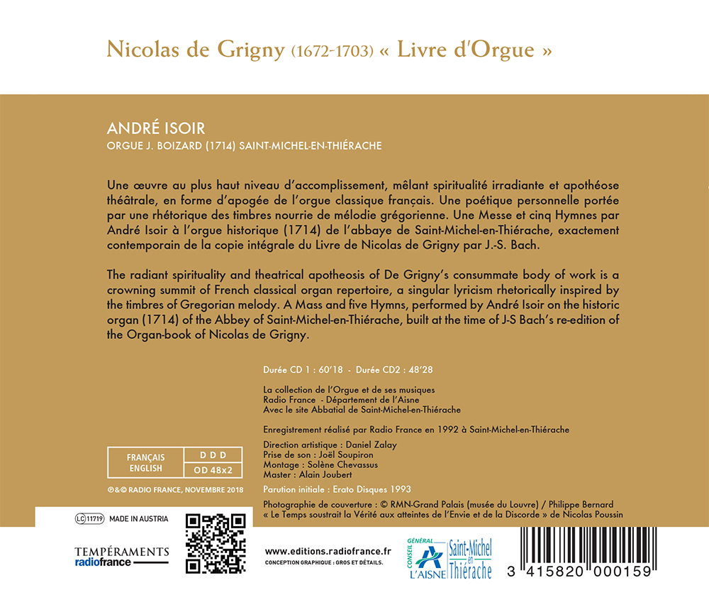 Cette œuvre mêle spiritualité irradiante et apothéose théâtrale, en forme d’apogée de l’orgue classique français. Une Messe et cinq Hymnes par André Isoir à l’orgue historique (1714) de l’abbaye de Saint-Michel-en-Thiérache, exactement contemporain de la copie intégrale du Livre de Grigny par Jean-Sébastien Bach.