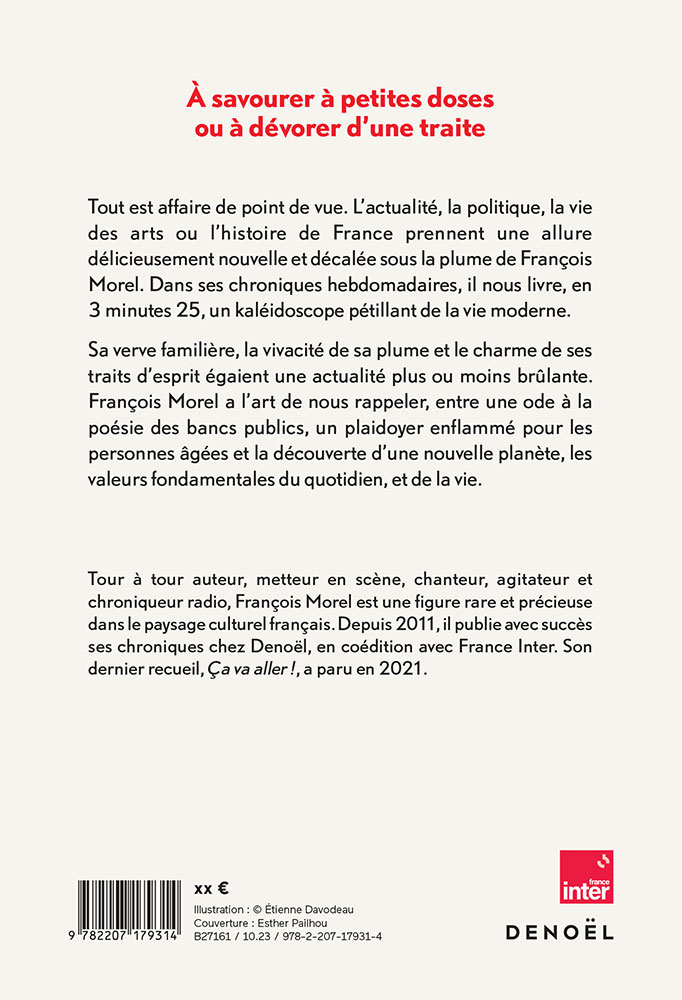 Tour à tour auteur, metteur en scène, chanteur, agitateur et chroniqueur radio, François Morel est une figure rare et précieuse dans le paysage culturel français. Depuis 2011, il publie avec succès ses chroniques chez Denoël, en coédition avec France Inter, son dernier recueil Ça va aller !, a paru en 2021.