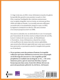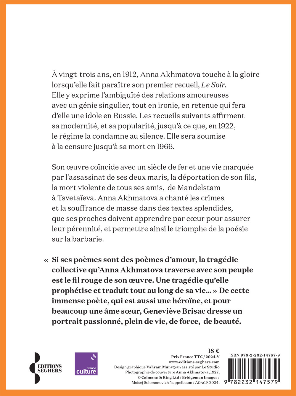 À vingt-trois ans, en 1912, Anna Akhmatova touche à la gloire lorsqu’elle fait paraître son premier recueil, Le Soir. Elle y exprime l’ambiguïté des relations amoureuses avec un génie singulier, tout en ironie et en retenue qui fera d’elle une idole en Russie. Les recueils suivants affirment sa modernité et sa popularité, jusqu’à ce que, en 1922, le régime la condamne au silence. Elle sera soumise à la censure jusqu’à sa mort, en 1966.