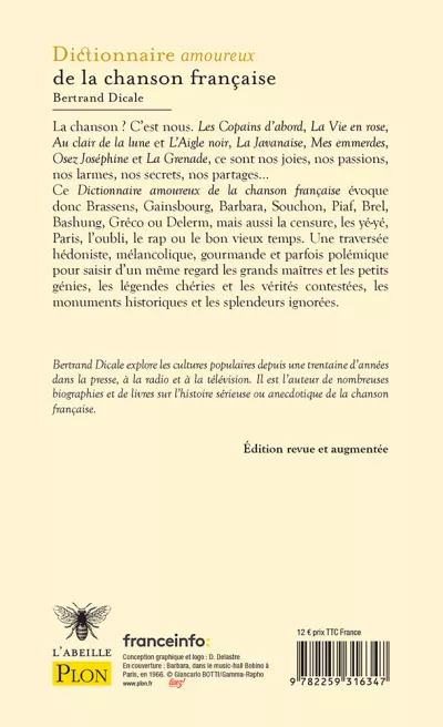 Ce Dictionnaire amoureux de la chanson française évoque donc Brassens, Gainsbourg, Barbara, Souchon, Piaf, Brel, Bashung, Gréco ou Delerm, mais aussi la censure, les yé-yé, Paris, l’oubli, le rap ou le bon vieux temps. Une traversée hédoniste, mélancolique, gourmande et parfois polémique pour saisir d’un même regard les grands maîtres et les petits génies, les légendes chéries et les vérités contestées, les monuments historiques et les splendeurs ignorées.