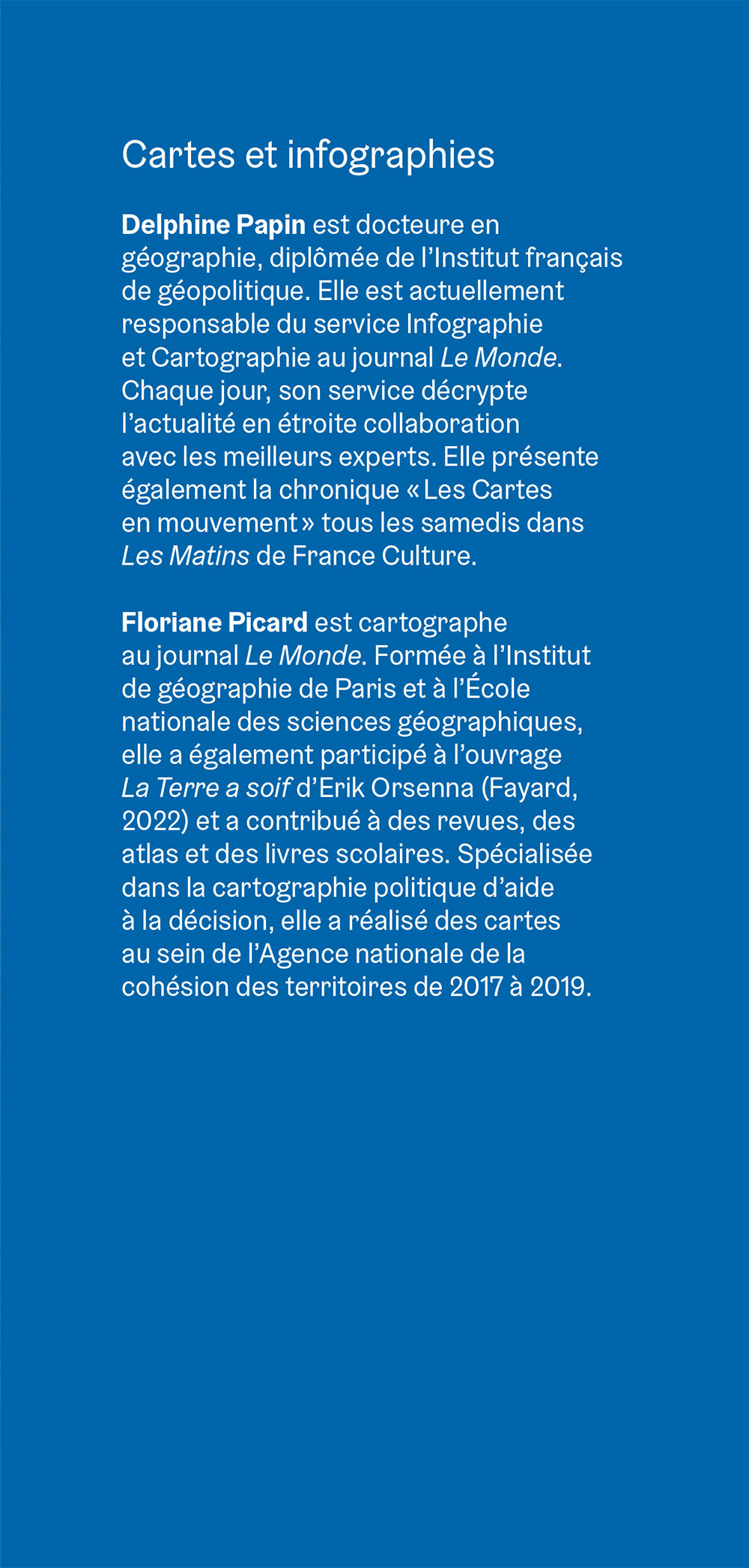 Les cartes et infographies pour comprendre ce territoire vaste et complexe sont réalisées par Delphine Papin qui dirige le service de Cartographie et d’Infographie du journal Le Monde. La réalisation des illustrations est signée Floriane Picard.