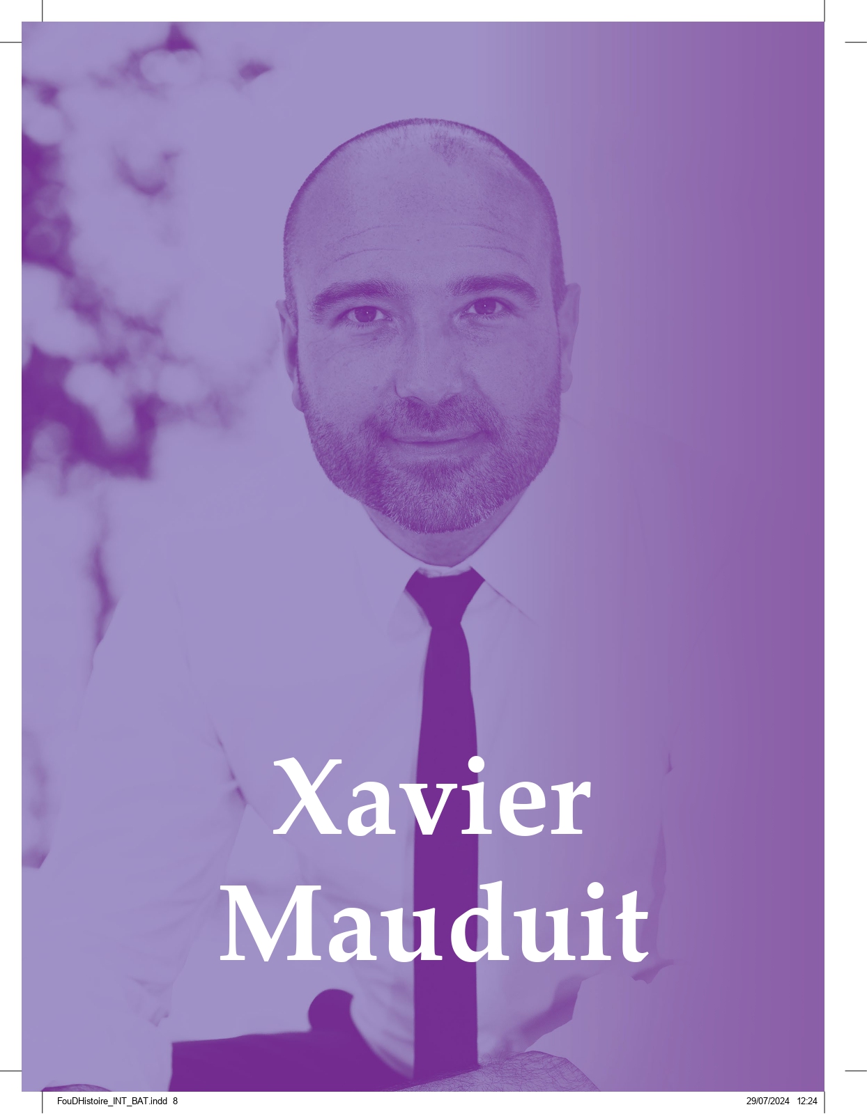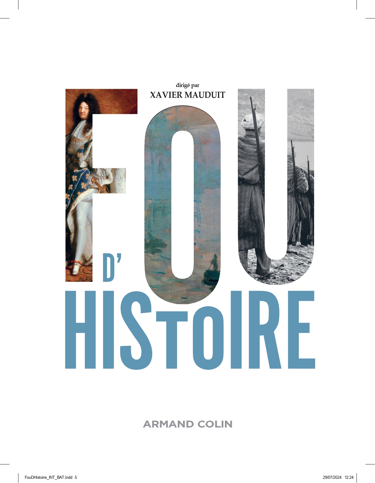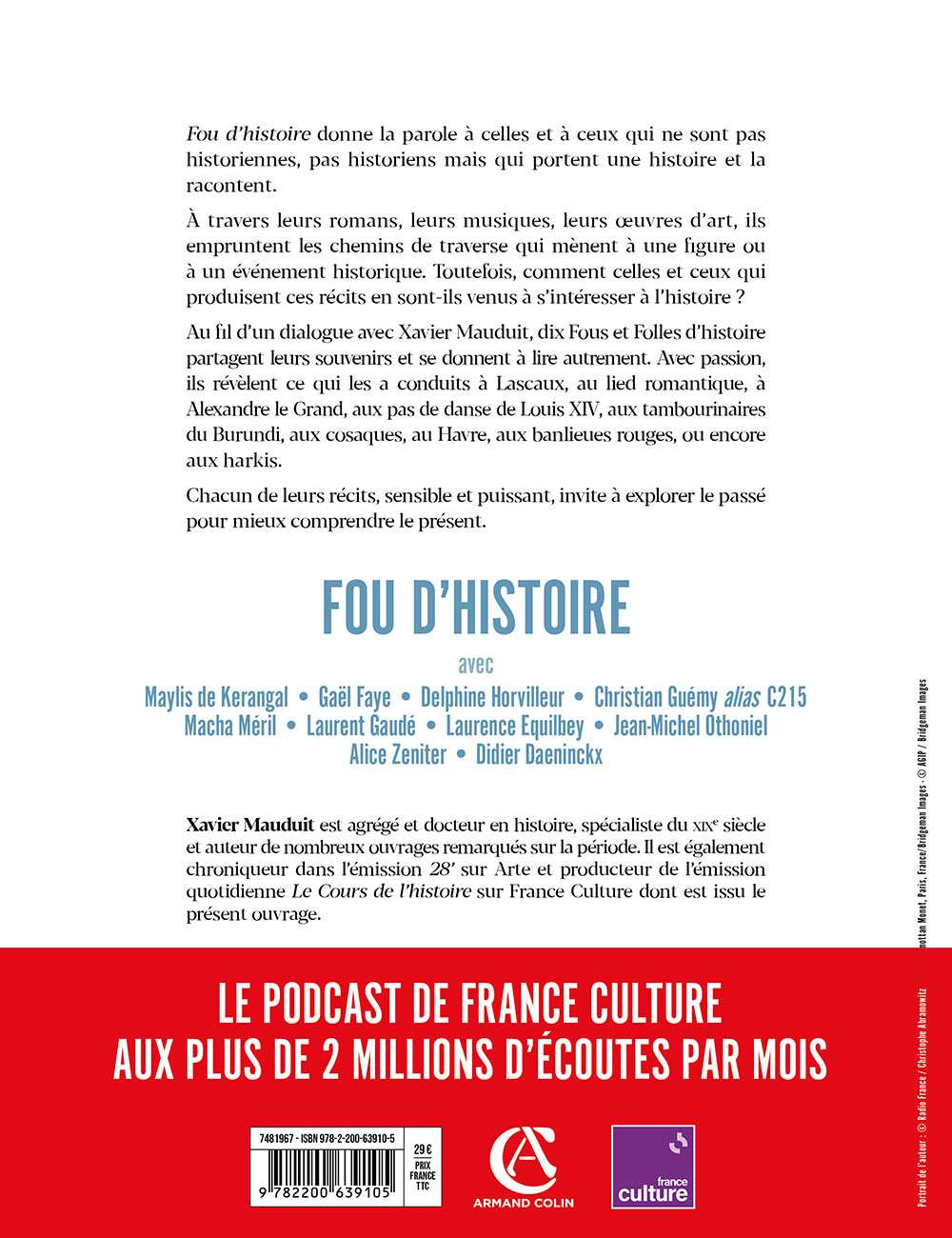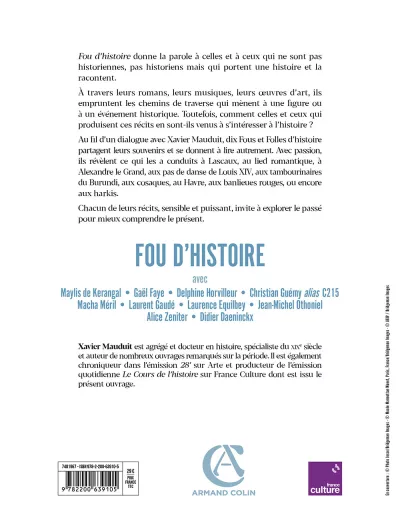 Il donne la parole à ceux et celles qui ne sont pas historiens, pas historiennes, mais qui portent une histoire et qui racontent la grande histoire. Dans cette volonté de transmission et de partage, l’ouvrage Fou d’histoire réunit dix personnalités du monde littéraire et artistique qui invitent le lecteur à voyager dans le temps à travers leurs récits personnels. Leurs entretiens ont été retranscrits, illustrés et enrichis par le regard historique de Xavier Mauduit.