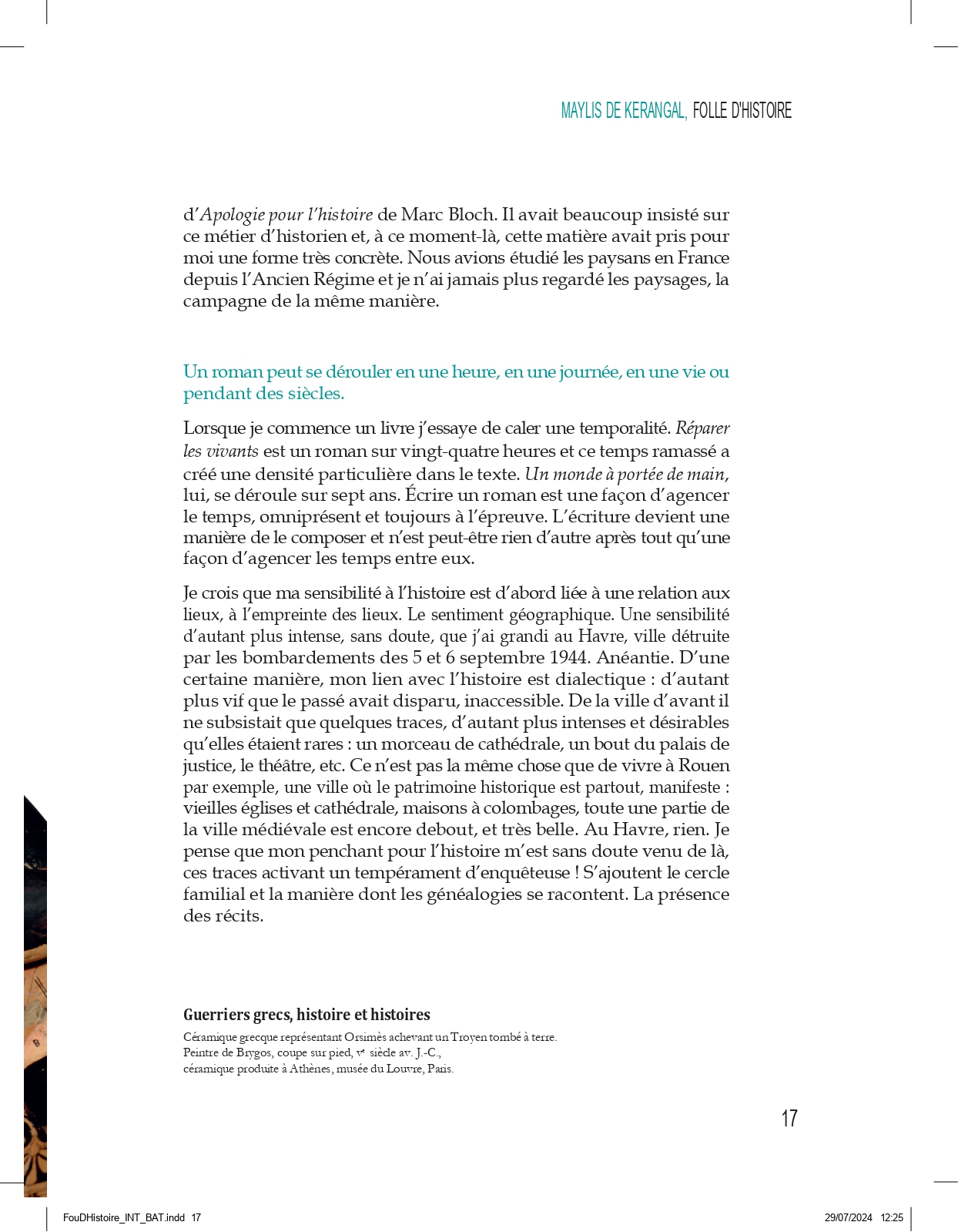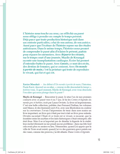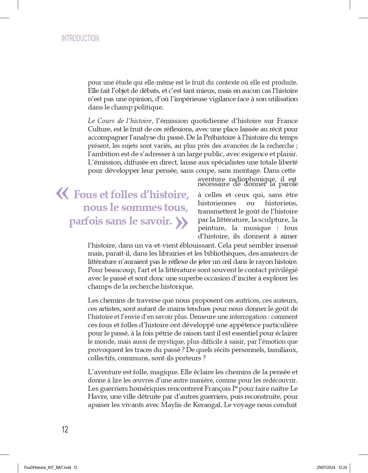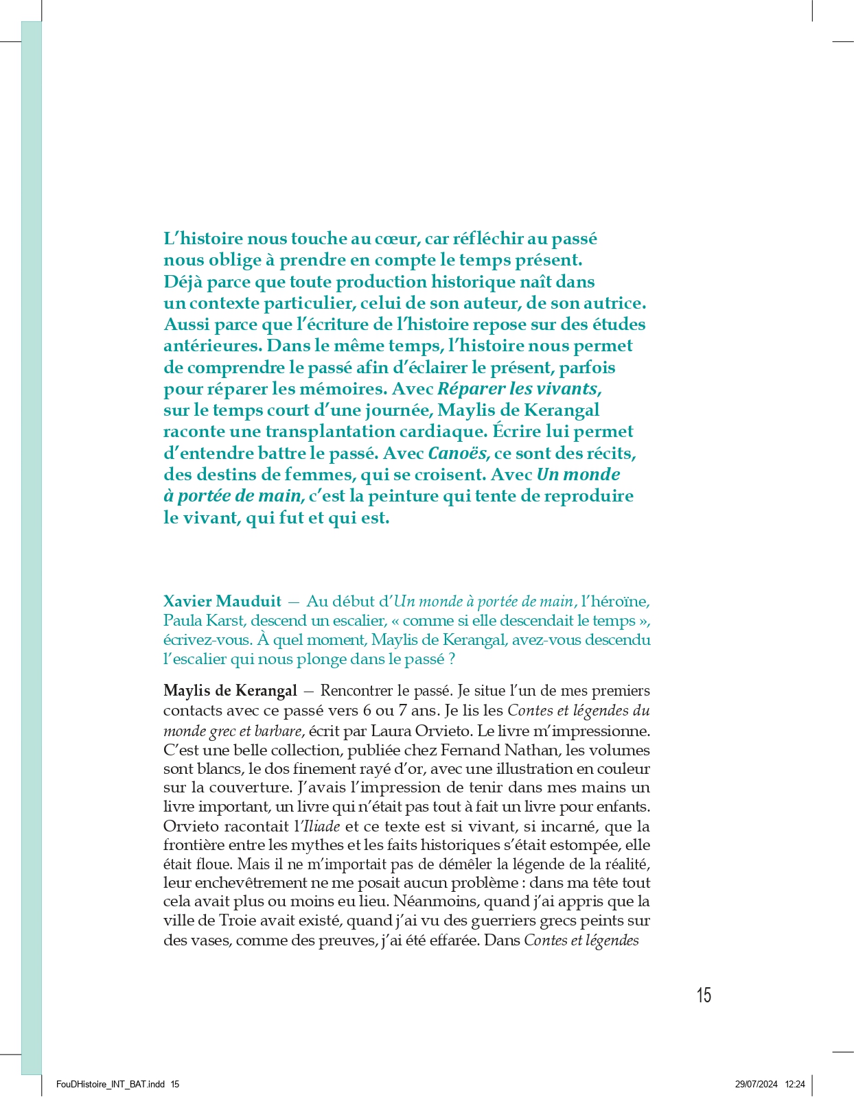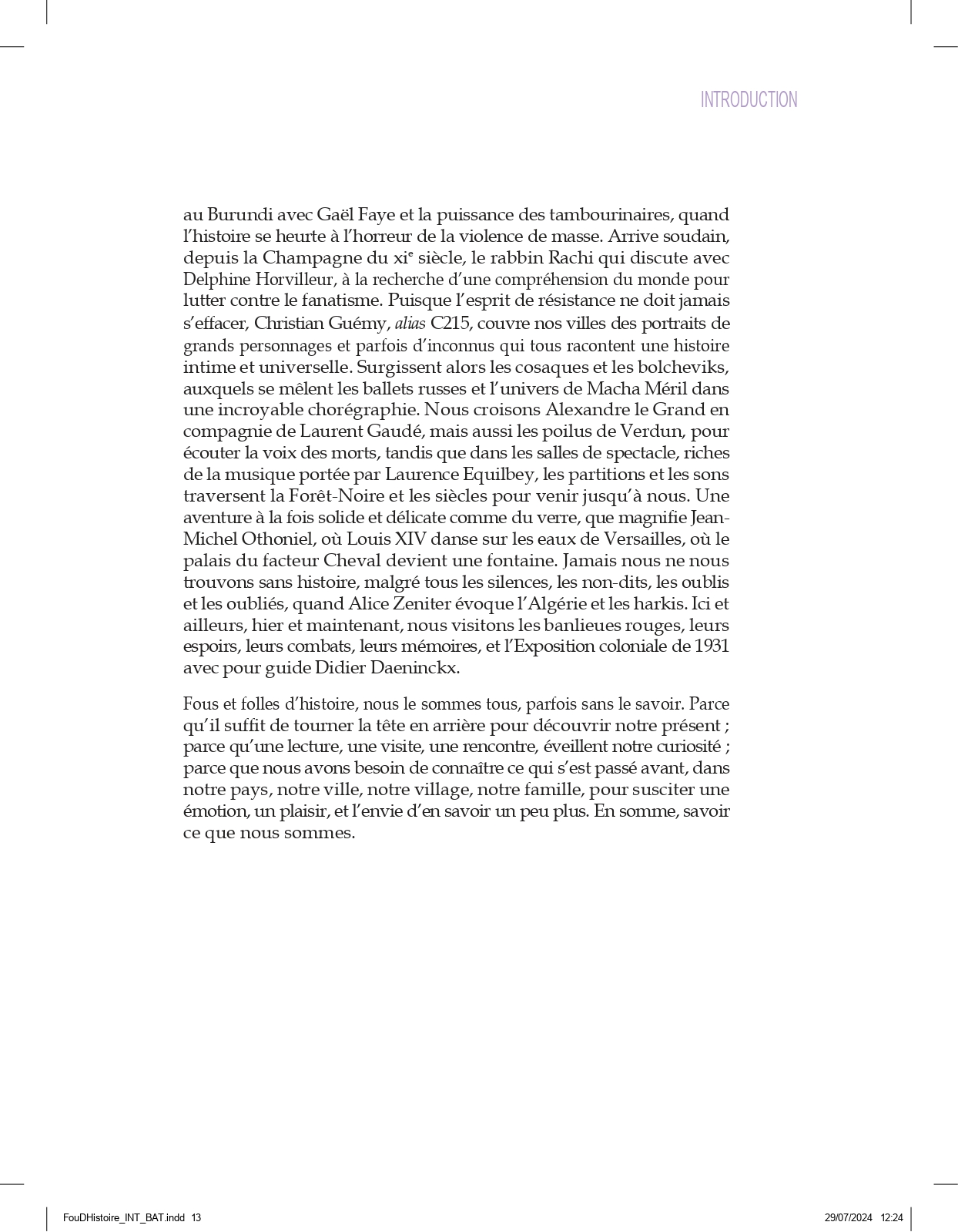 Il donne la parole à ceux et celles qui ne sont pas historiens, pas historiennes, mais qui portent une histoire et qui racontent la grande histoire. Dans cette volonté de transmission et de partage, l’ouvrage Fou d’histoire réunit dix personnalités du monde littéraire et artistique qui invitent le lecteur à voyager dans le temps à travers leurs récits personnels. Leurs entretiens ont été retranscrits, illustrés et enrichis par le regard historique de Xavier Mauduit.