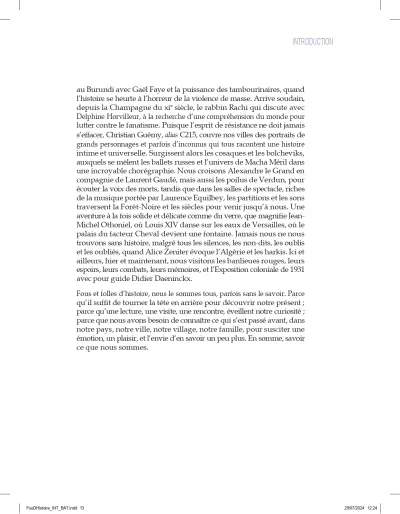 Ces dix invités racontent leur France plurielle et bien souvent l’histoire déborde au-delà des frontières. Ainsi nous découvrons Le Havre d'Alice Zeniter, de sa fondation par François Ier à sa reconstruction après la Seconde Guerre mondiale. Nous entrons dans les secrets de fabrication des sculptures de Jean-Michel Othoniel qui s'est inspiré des pas de danse du Roi Soleil pour ses fontaines. Nous partons sur les traces des tambourinaires du Burundi avec Gaël Faye qui nous parle du génocide des Tutsi. Macha Méril, quant à elle, rappelle à nous les Russes blancs qui ont quitté la Russie suite à la révolution d'Octobre. Chacun de leur récit passionné et sensible invite le lecteur à découvrir une autre histoire de la France.