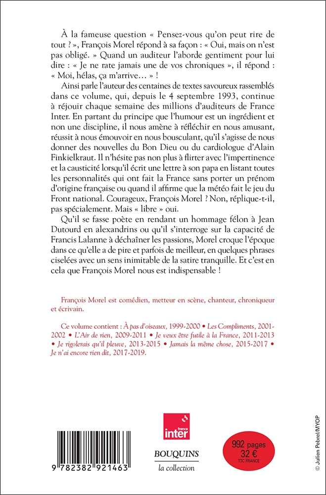 Ainsi parle l’auteur des centaines de textes savoureux rassemblés dans ce volume, qui, depuis septembre 2009, continue à réjouir chaque semaine des millions d’auditeurs de France Inter. En partant du principe que l’humour est un ingrédient et non une discipline, il nous amène à réfléchir en nous amusant, réussit à nous émouvoir en nous bousculant, qu’il s’agisse de nous donner des nouvelles du Bon Dieu ou du cardiologue d’Alain Finkielkraut. Il n’hésite pas non plus à flirter avec l’impertinence et la causticité lorsqu’il écrit une lettre à son papa avant un grand rendez-vous électoral ou qu’il fait la liste d’un certain nombre de personnalités qui ont fait la France sans porter un prénom d’origine française. Courageux, François Morel ? Non, réplique-t-il, pas spécialement. Mais « libre » oui.