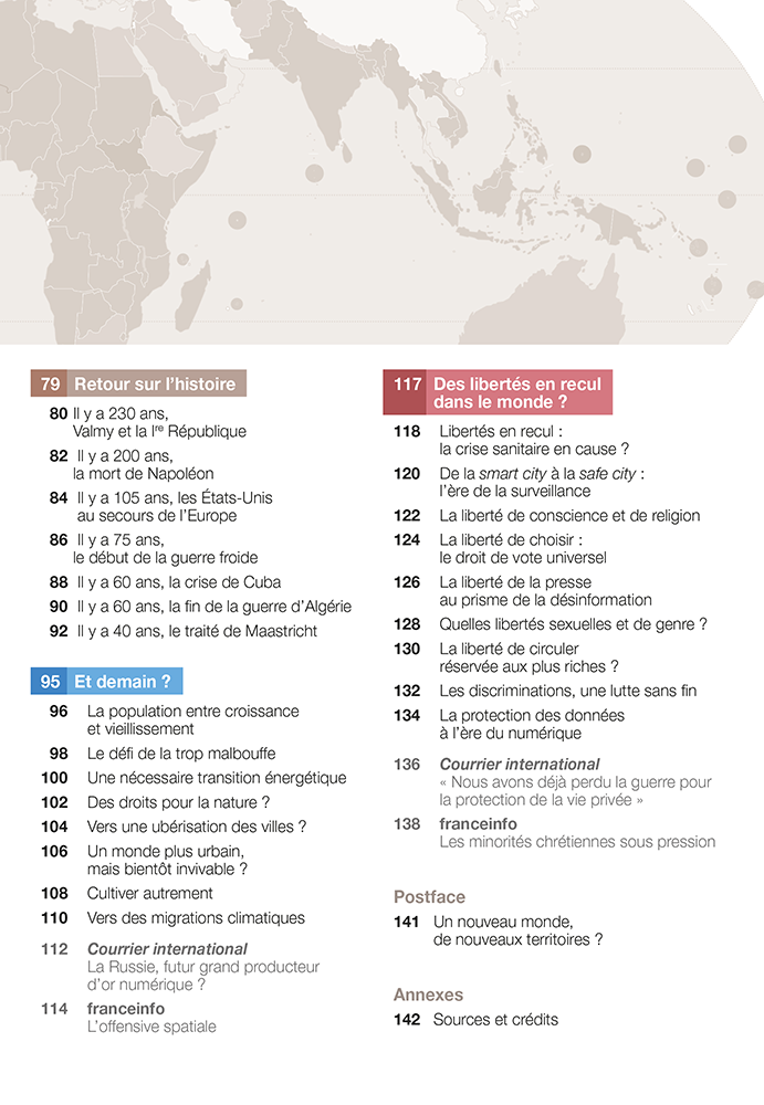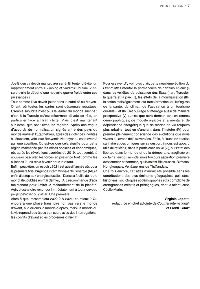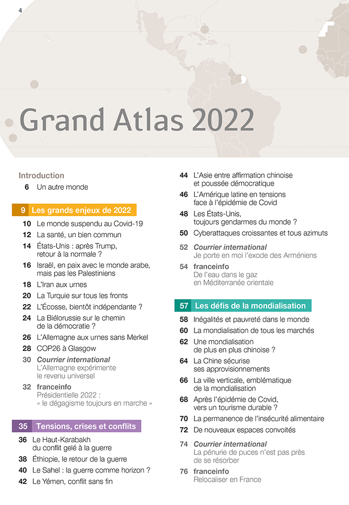 Toutes les questions d'actualité et les enjeux qui vont faire 2022, avec des cartes, des infographies et des synthèses efficaces. Des chiffres clés, des définitions, des citations remettent en contexte chaque thème. Le Grand Atlas 2022 traitera : des tensions ; des crises et conflits actuels ; des défis de la mondialisation ; de rappels historiques et de leurs enjeux et conséquences encore actuelles ; des enjeux de demain ; et d’un dossier spécial consacré aux libertés dans le monde. Un tour d’horizon complet des grands enjeux internationaux.