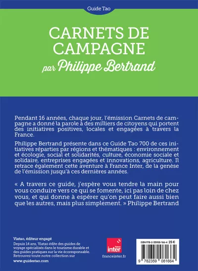 Le Guide Tao Carnets de campagne propose une sélection des meilleures initiatives citoyennes présentées dans l’émission Carnets de campagne sur France Inter, animée par Philippe Bertrand de 2006 à 2022.