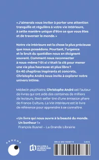 La vie intérieure, c'est ce flot de pensées, de souvenirs, de projets, de ressentis émotionnels et corporels, qui se font et se défont en permanence au plus profond de nous. Elle peut n'être qu'un lointain murmure, mais à qui sait l'écouter, elle est une source d'enseignements extraordinaire pour se connaître, se comprendre et mieux conduire son existence. J'aimerais vous inviter à porter une attention tranquille et régulière à votre vie intérieure, à cette manière unique d'être ce que vous êtes et de traverser le monde. Dans nos sociétés tournées vers le matérialisme et les apparences, ce détour est essentiel et fécond : pour notre équilibre émotionnel, notre créativité, notre empathie et notre liberté.