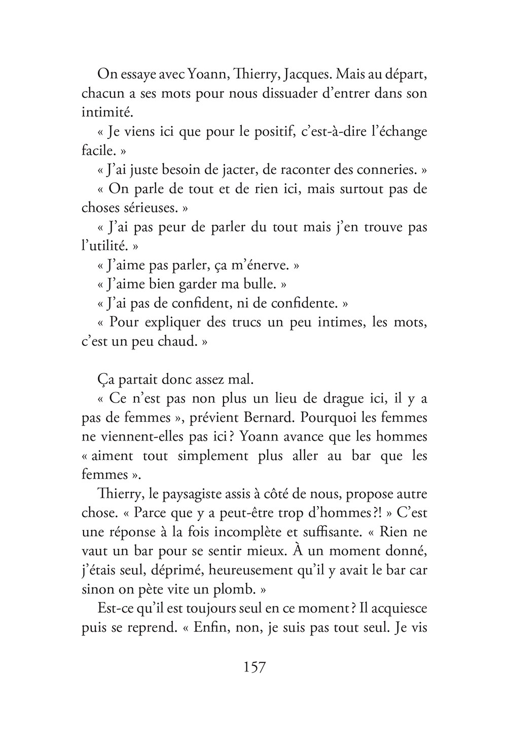 Puis elles sont allées voir de l’autre côté, et ont entendu les silences, les rires gênés, les pleurs, les propos déplacés d’hommes bravaches ou timides, les gagnants de la masculinité, et les oubliés. D'Épinal à la Défense, retraité, cadre ou infirmier : que disent les hommes quand ils parlent de doutes et de douleurs ? Comment se débrouillent-ils dans un monde en recomposition ? Réinterrogent-ils leur place ?