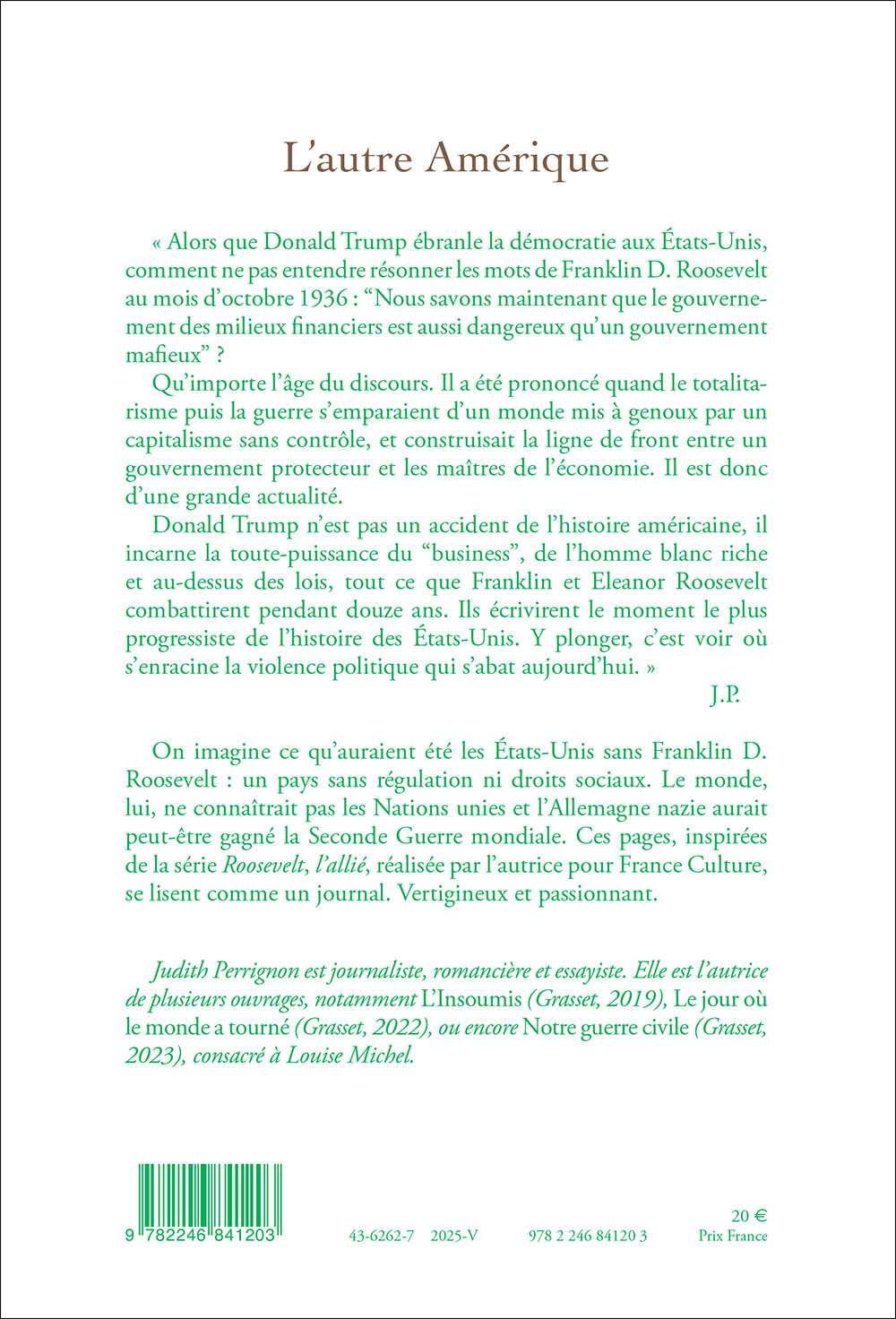 On imagine parfois ce qu’auraient été les États-Unis sans le 32ème président Franklin Delano Roosevelt : un pays sans droits sociaux. Le monde, lui, ne connaîtrait pas les Nations Unies et l’Allemagne nazie aurait peut-être gagné la Seconde Guerre mondiale. De la crise financière de 1929 jusqu’à sa mort au lendemain de la guerre, Roosevelt a changé la trajectoire des États-Unis et du monde. Comme un miroir, ces pages vertigineuses et passionnantes nous révèlent l’autre visage d’une Amérique perdue, et nous racontent une histoire exceptionnelle – portée par l’amour entre Franklin et Eleanor ; et par l’amitié entre Roosevelt et son bras droit.