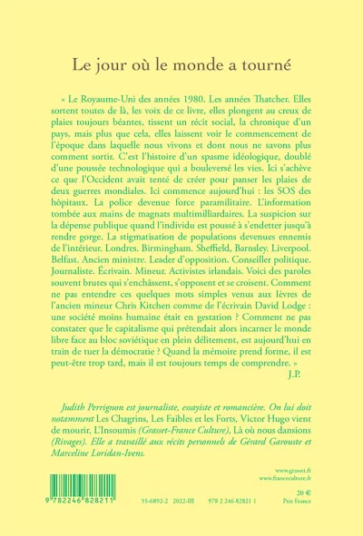 Londres. Birmingham. Sheffield, Barnsley. Liverpool. Belfast. Ancien ministre. Leader d’opposition. Conseiller politique. Journaliste. Écrivain. Mineur. Activistes irlandais. Voici des paroles souvent brutes qui s’enchâssent, s’opposent et se croisent. Comment ne pas entendre ces quelques mots simples venus aux lèvres de l’ancien mineur Chris Kitchen comme de l’écrivain David Lodge : une société moins humaine était en gestation ?
