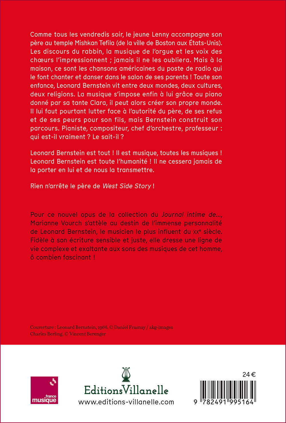Comme tous les vendredis soir, le jeune Lenny accompagne son père au temple Mishkan Tefila (de la ville de Boston aux États-Unis). Les discours du rabbin, la musique de l’orgue et les voix des chœurs l’impressionnent ; jamais il ne les oubliera. Mais à la maison, ce sont les chansons américaines du poste de radio qui le font chanter et danser dans le salon de ses parents ! Toute son enfance, Leonard Bernstein vit entre deux mondes, deux cultures, deux religions. La musique s’impose enfin à lui grâce au piano donné par sa tante Clara, il peut alors créer son propre monde.