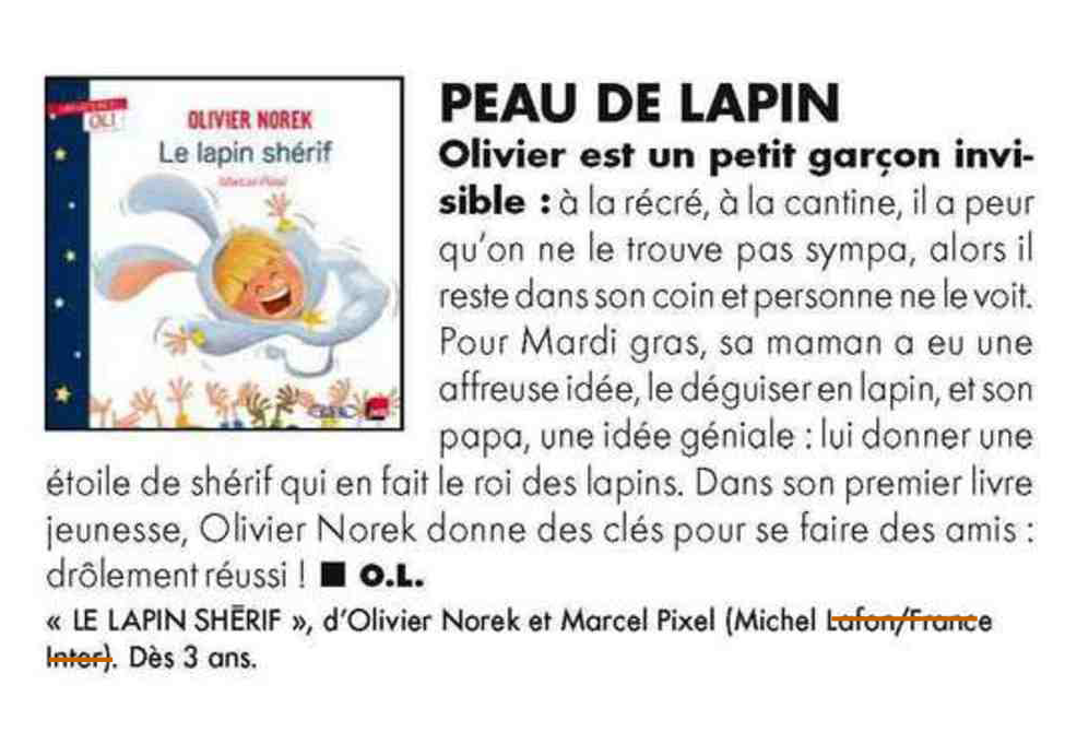 Haut comme trois pommes, Olivier a toujours l’impression qu’on ne le voit pas, qu’on ne l’entend pas. À l’école, il reste invisible, de peur que ses camarades ne le trouvent pas drôle, pas intéressant. Alors quand vient le jour de Mardi gras et que sa maman lui confectionne un déguisement de lapin, Olivier est persuadé que tout le monde va se moquer de lui et que ce sera trop la honte dans la cour de récréation... Un lapin, une étoile de shérif, une histoire sur la confiance en soi.