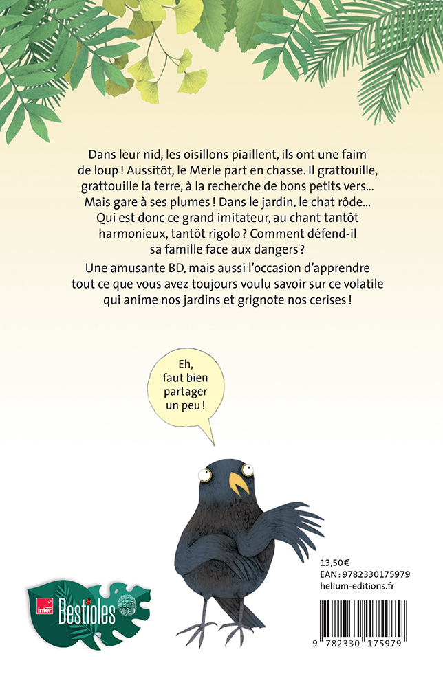 Au fil d’une amusante discussion avec lui, on apprend notamment que cet oiseau aime prendre des bains puis sécher au soleil, ou encore que chaque individu a un chant bien à lui… Mais cet album est aussi l’occasion de découvrir le merle en action : futé, il parvient à déjouer les plans de ses plus dangereux prédateurs. Hop, le voilà qui tend un piège au chat, pour rejoindre son nid sain et sauf… Avant de repartir bille en tête en quête de vers de terre – car ses petits, tout oisillons soient-ils, ont un appétit d’ogre !