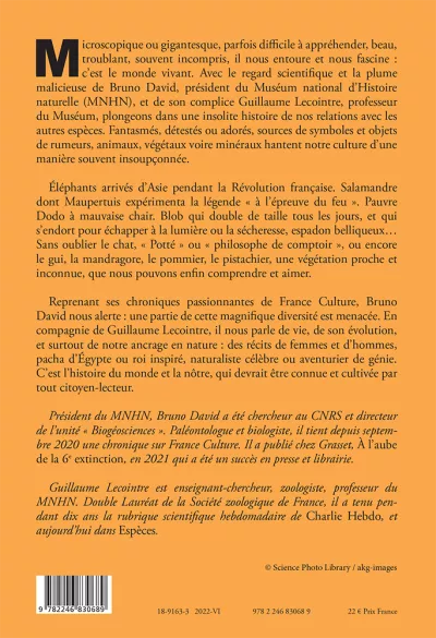 Avec le regard scientifique et la plume de Bruno David, président du Muséum national d’Histoire naturelle (MNHN), et de son complice Guillaume Lecointre, professeur du Muséum, plongeons dans cette brève encyclopédie, malicieuse et profonde de l'histoire de nos rapports avec les autres espèces. Fantasmés, détestés ou adorés, sources de symboles et objet de rumeurs, animaux et végétaux hantent notre culture d'une manière souvent insoupçonnée.