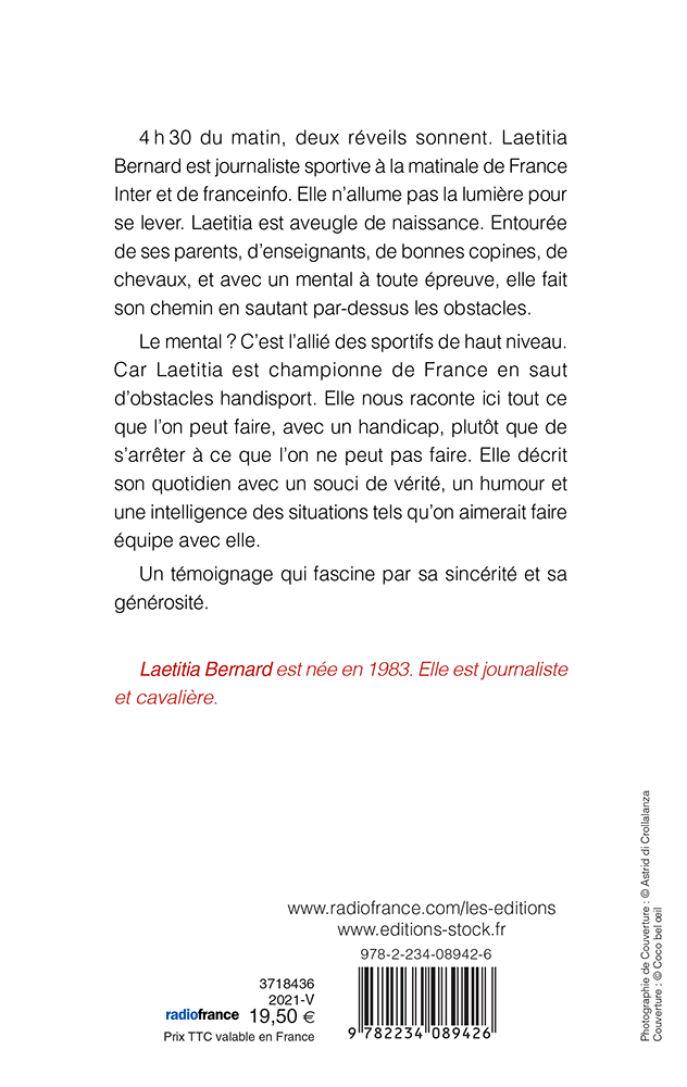 4h30 du matin, deux réveils sonnent, Laetitia Bernard est journaliste sportive à la matinale de France Inter et de franceinfo. Elle n’allume pas la lumière pour se lever, se doucher et démarrer la journée. Pourquoi ? Parce qu’elle est aveugle de naissance. Certes elle ne deviendra jamais actrice, mais sa vie est un véritable sport d’équipe : aidée de ses parents, d’enseignants, de bonnes copines, de chevaux, et dotée d’un mental à toute épreuve, elle s’intègre parmi les écoliers et collégiens valides, jusqu’au bac obtenu avec une mention bien.